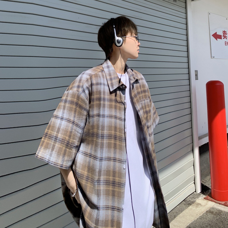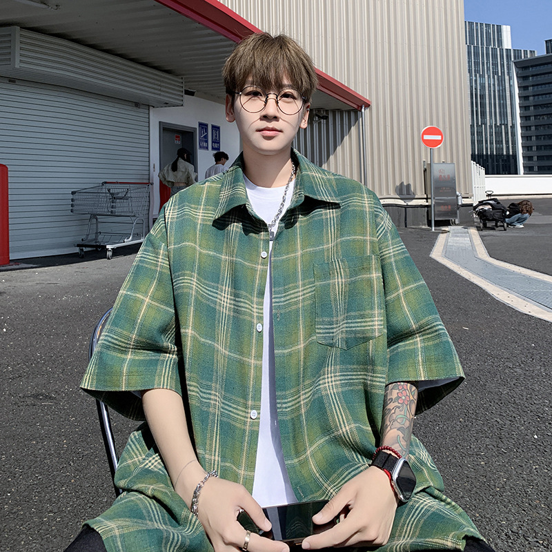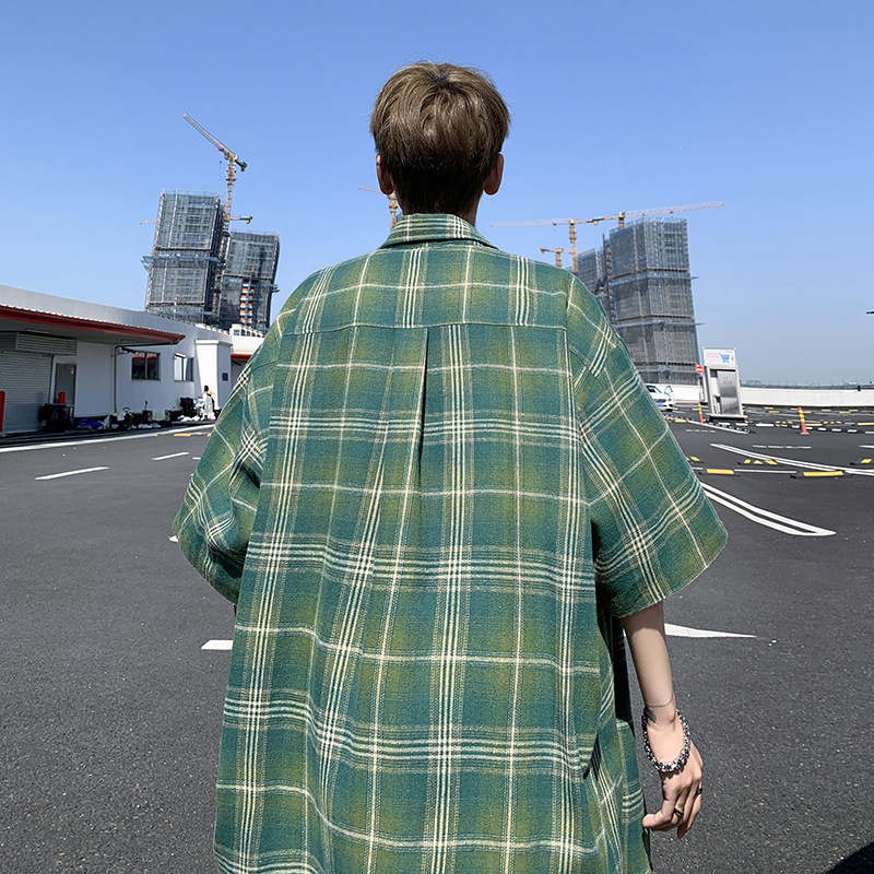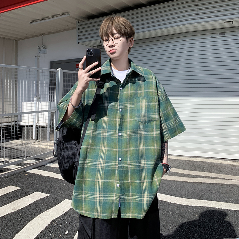 港风新款高街夏季格子中袖衬衫男潮牌薄款宽松学生休闲衬衣潮