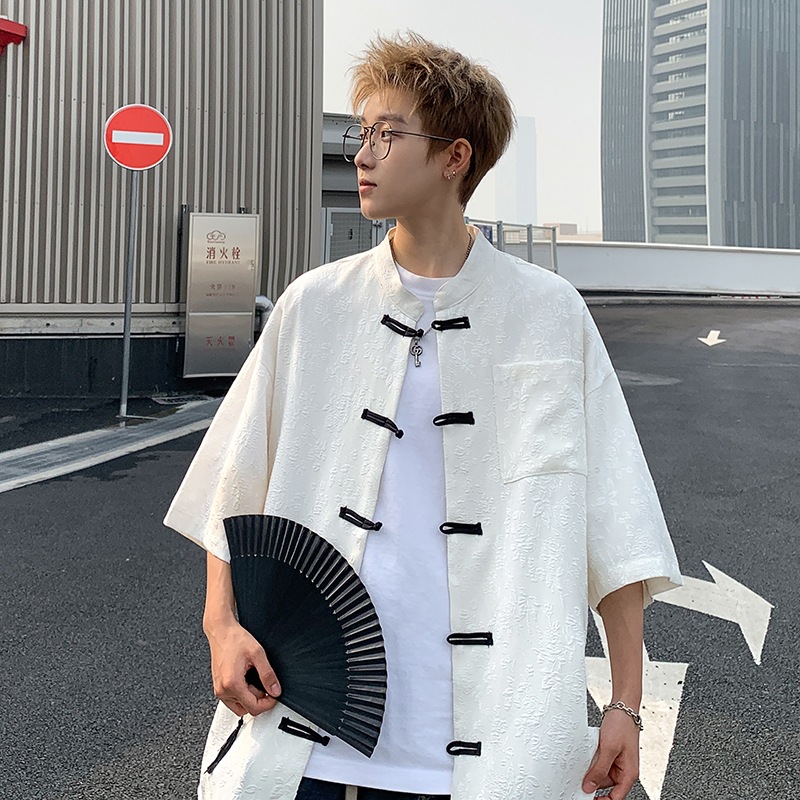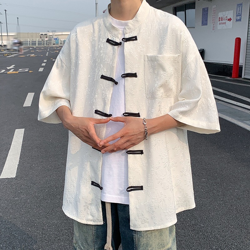 夏新款潮男新中式碎花7泡泡盘扣短袖五分袖衬衫