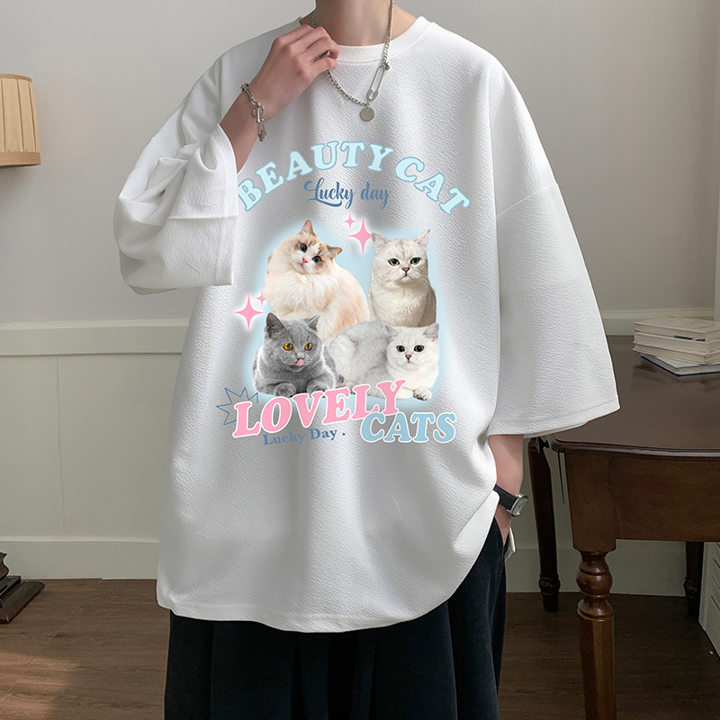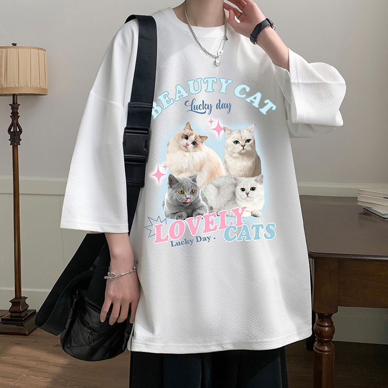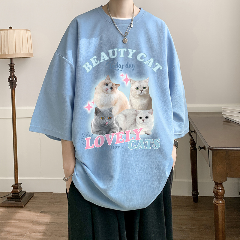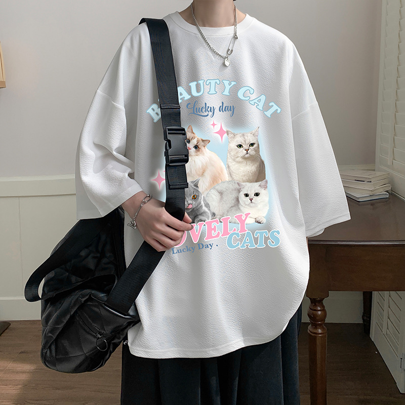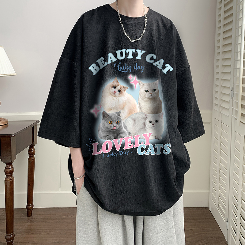 韩国美式复古猫咪印花短袖T恤男女宽松情侣风休闲短袖潮体恤