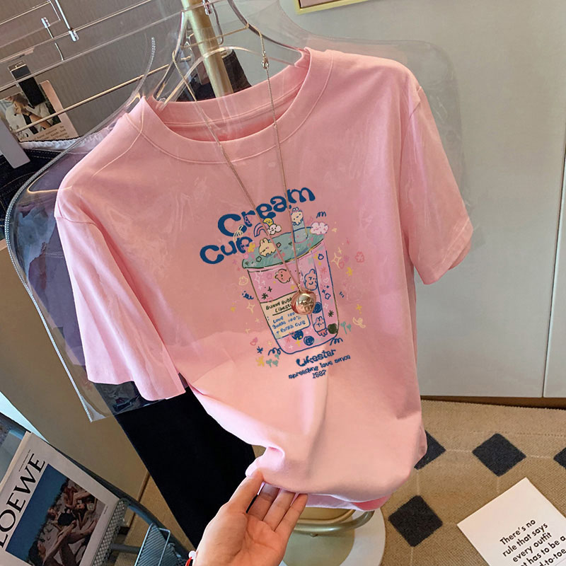 粉色短袖t恤女夏装2025新款纯棉高级感宽松甜美印花休闲百搭上衣