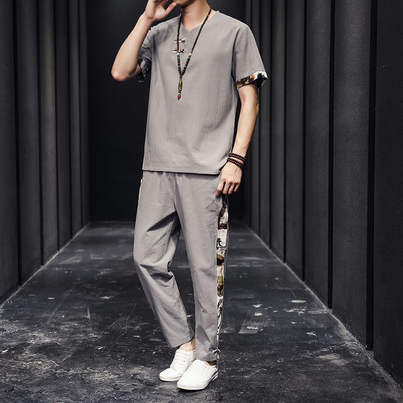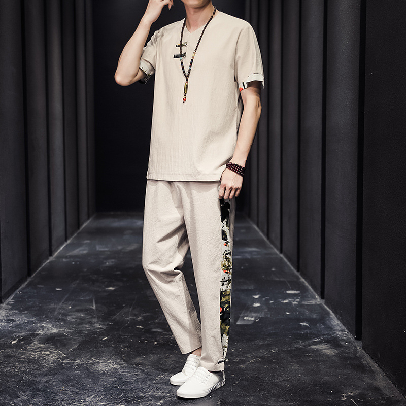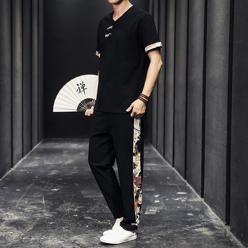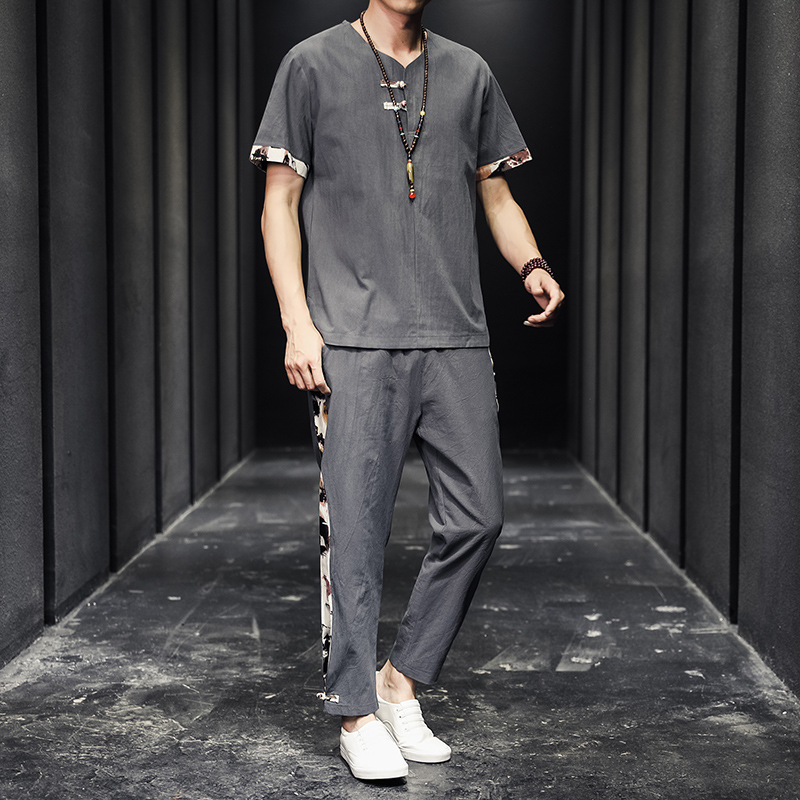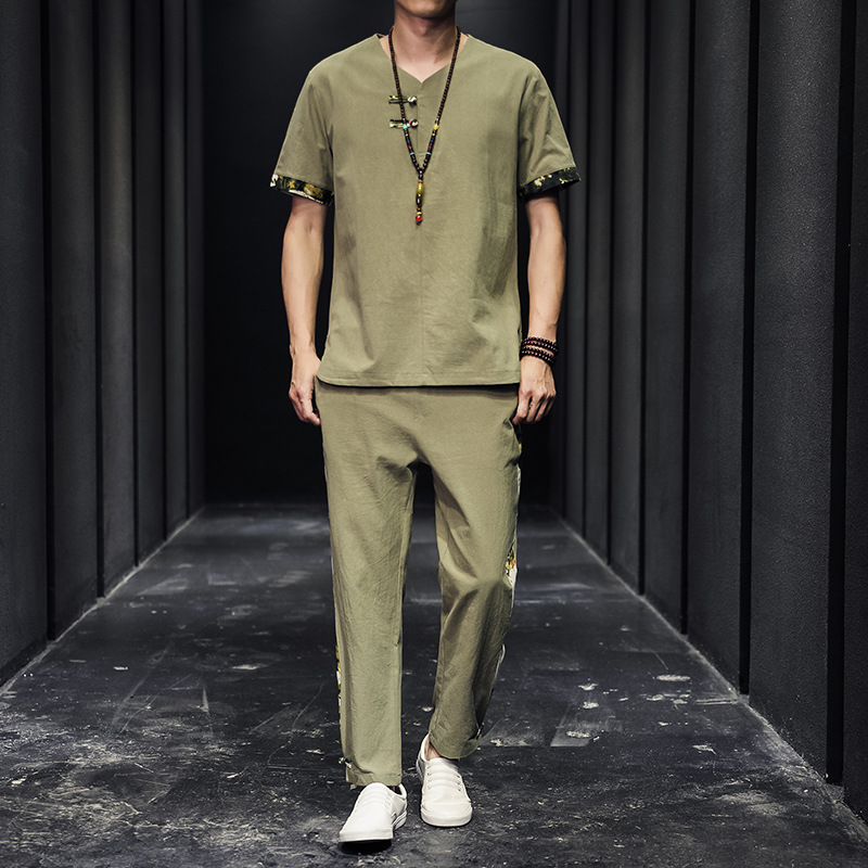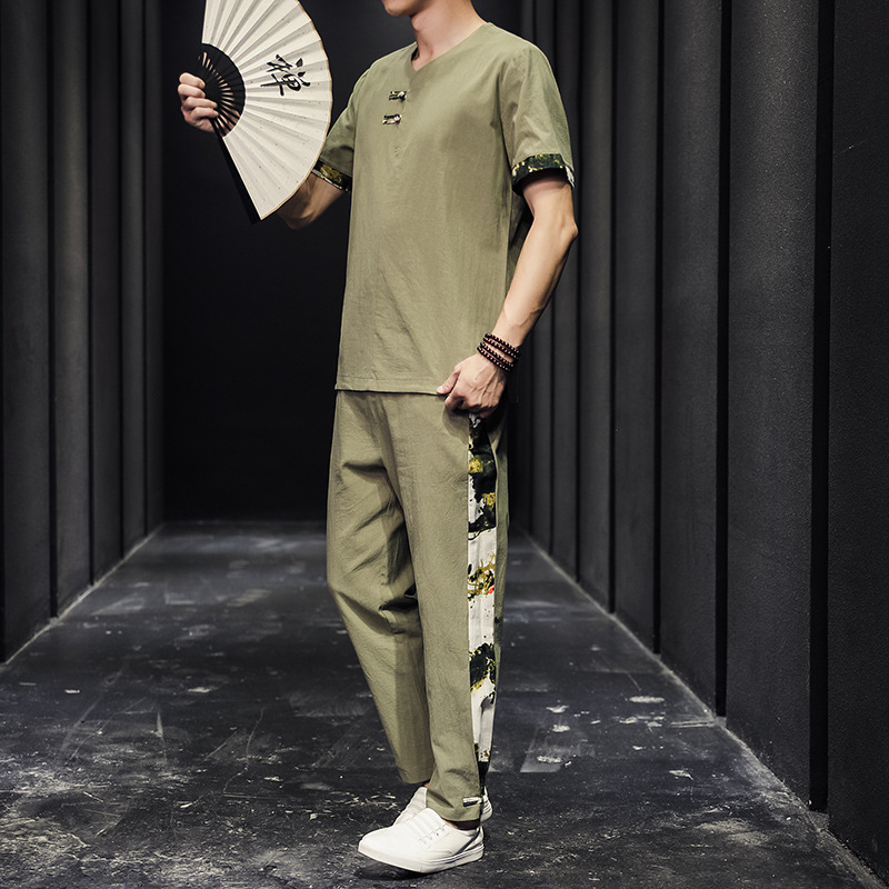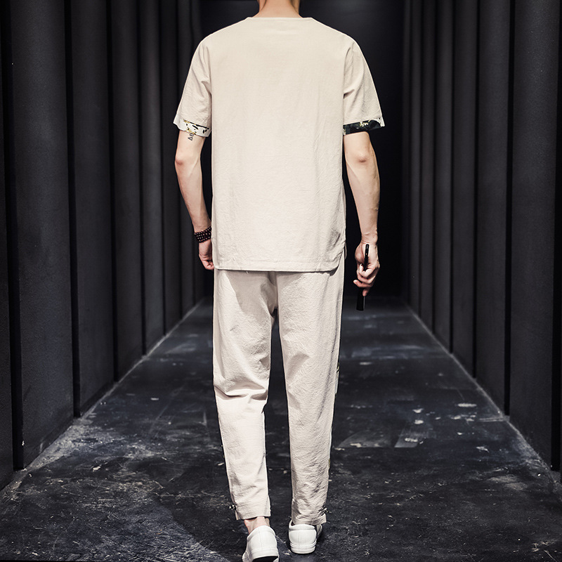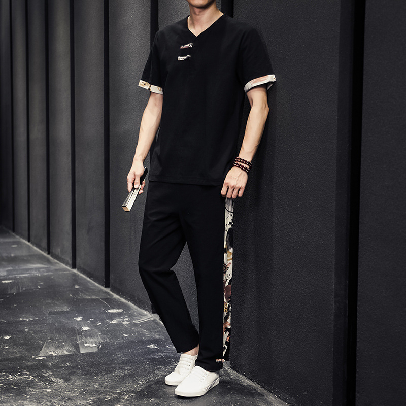 夏季新款中国风棉麻亚麻短袖T恤唐装大码男士盘扣套装