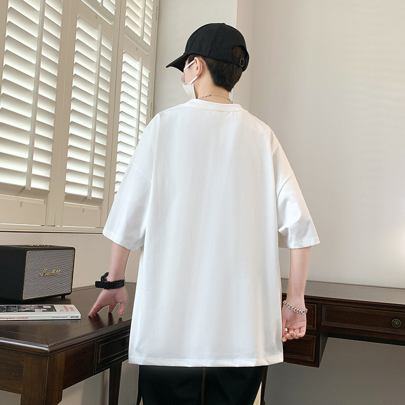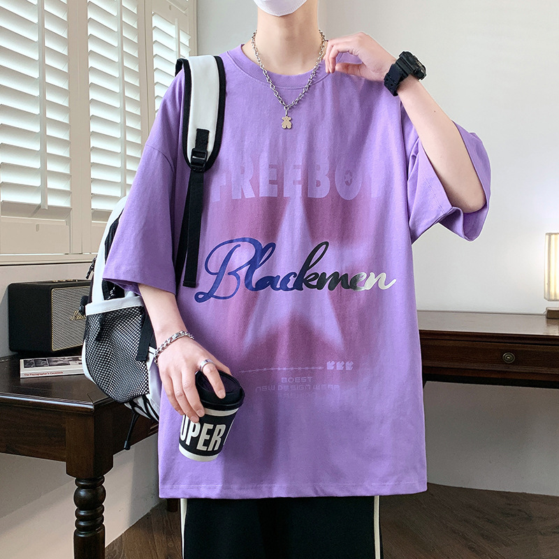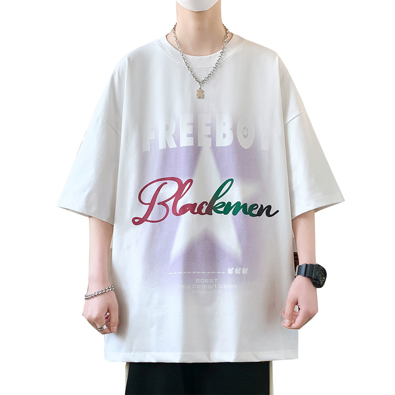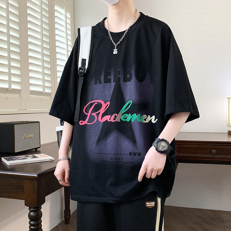 短袖男夏季新款字母印花美式t恤男潮牌休闲宽松五分袖体恤上衣服