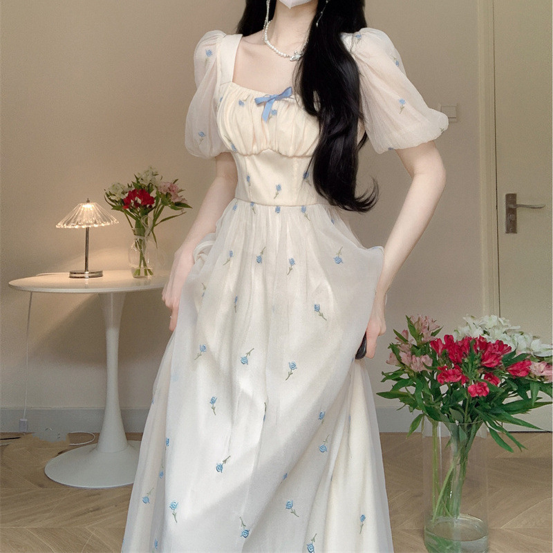 甜美风碎花茶歇连衣裙女夏季新款法式方领收腰显瘦泡泡袖长裙