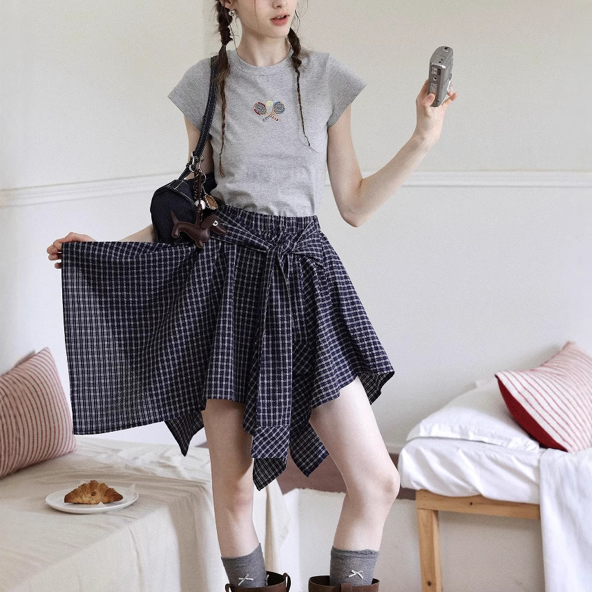 105℃的热爱' 梭织蓝格纹腰布系带不规则立裁高腰半裙