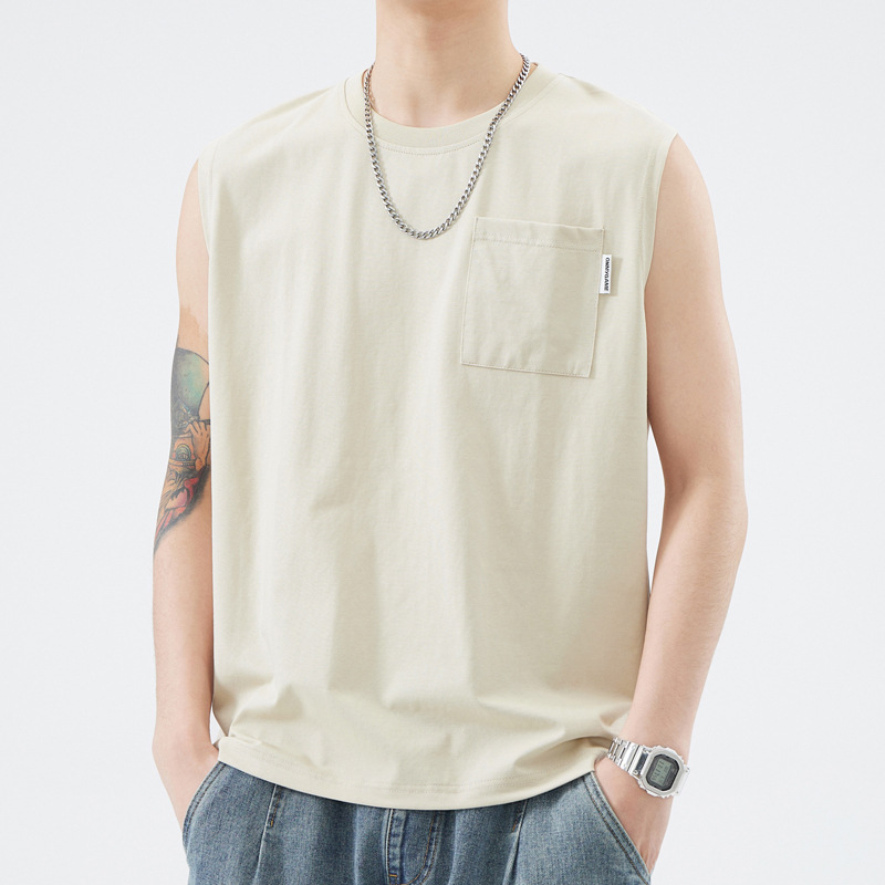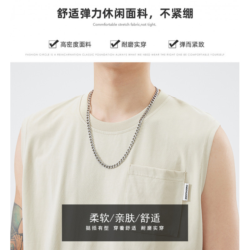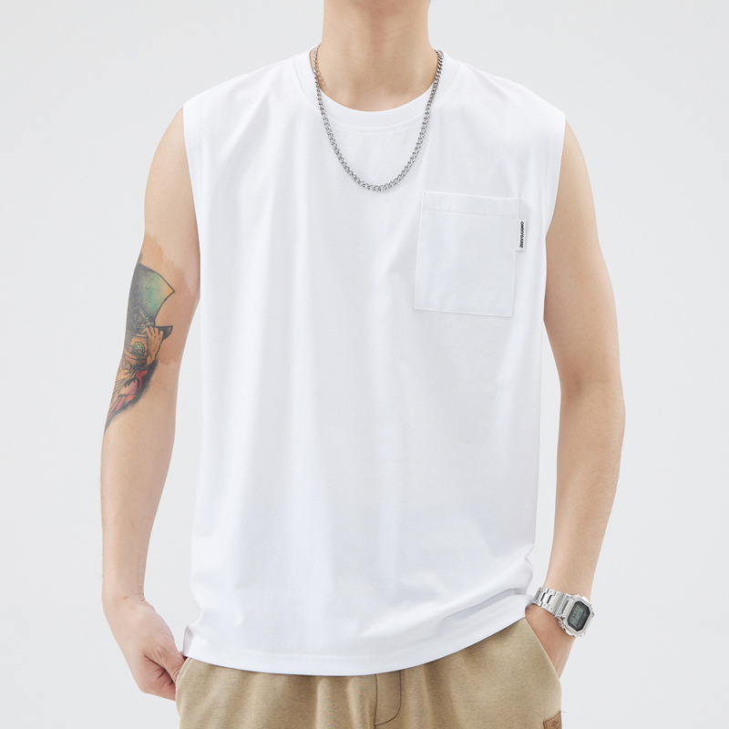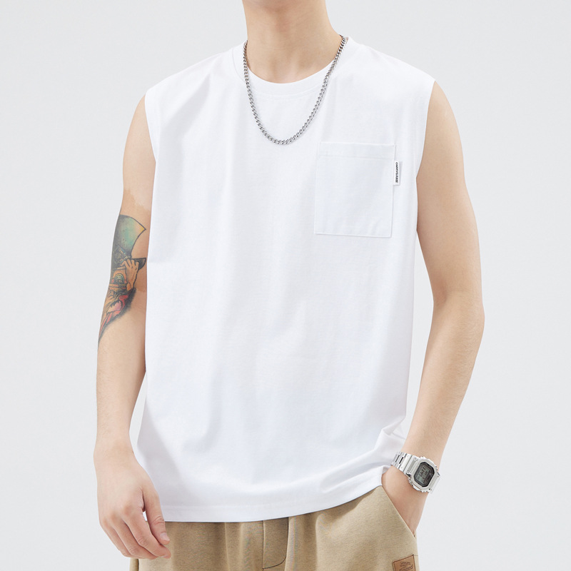 重磅口袋无袖T恤夏季新款男款简约背心潮流时尚百搭上衣白色