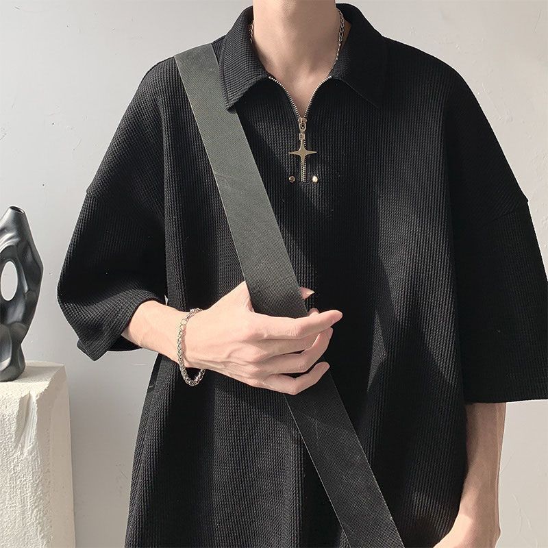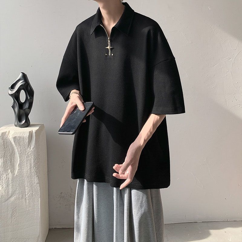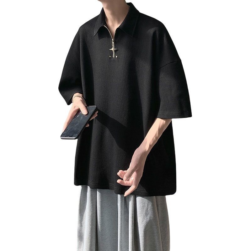 POLO衫男夏季宽松休闲纯色翻领上衣美式潮牌半拉链短袖t恤