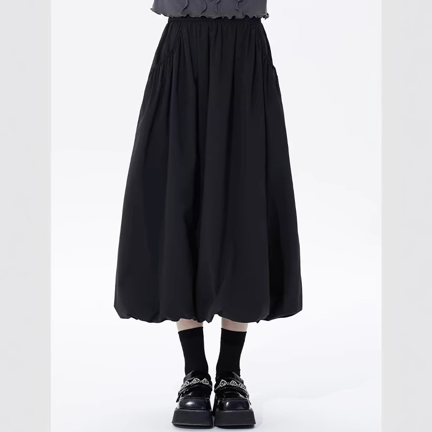 黑色褶皱花苞半身裙春季长款松紧腰宽松复古小个子A字裙