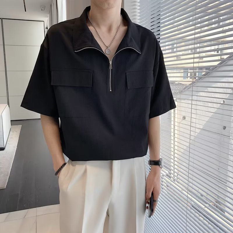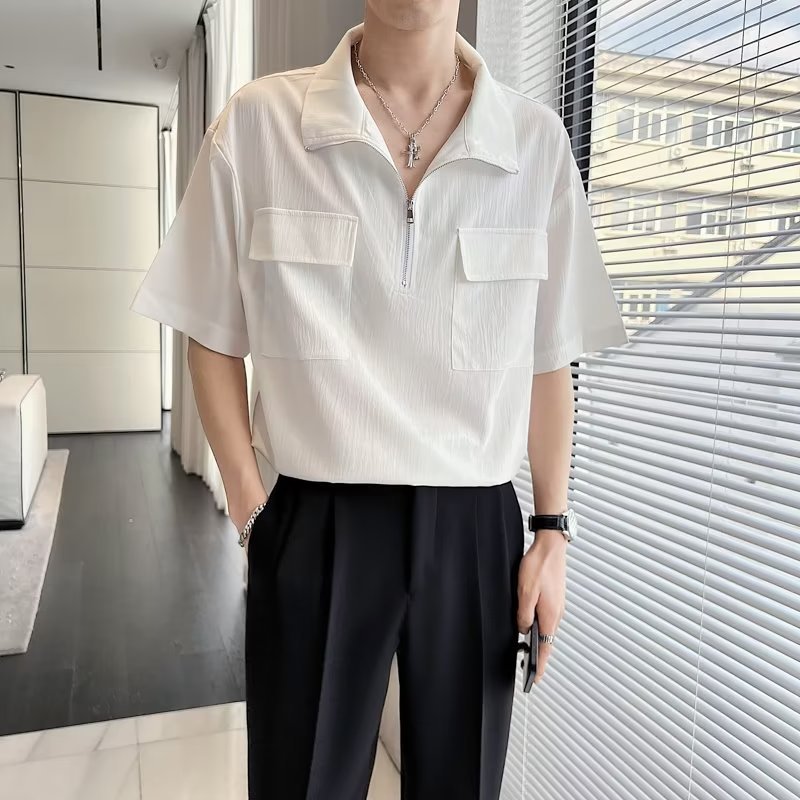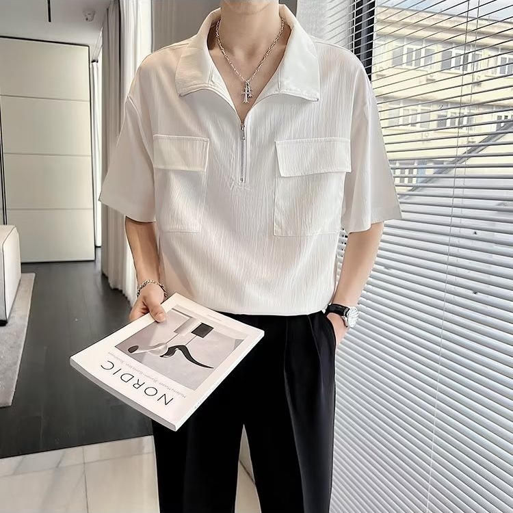 夏季冰丝半拉链polo衫男潮流设计感小众宽松休闲纯色翻领短袖t恤
