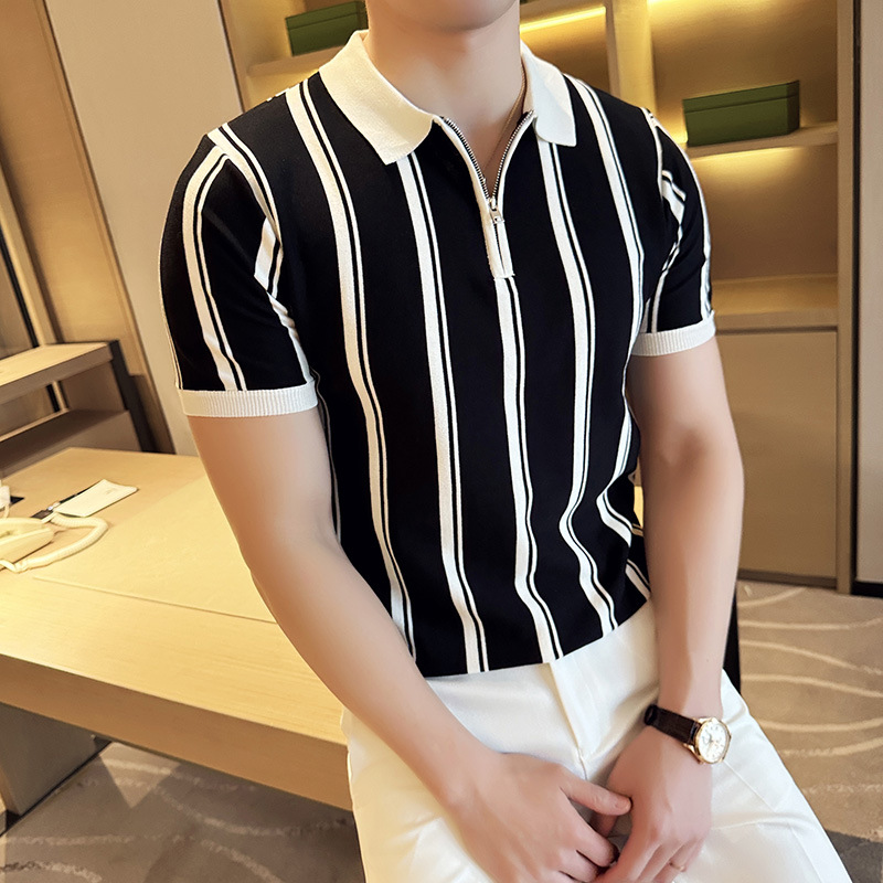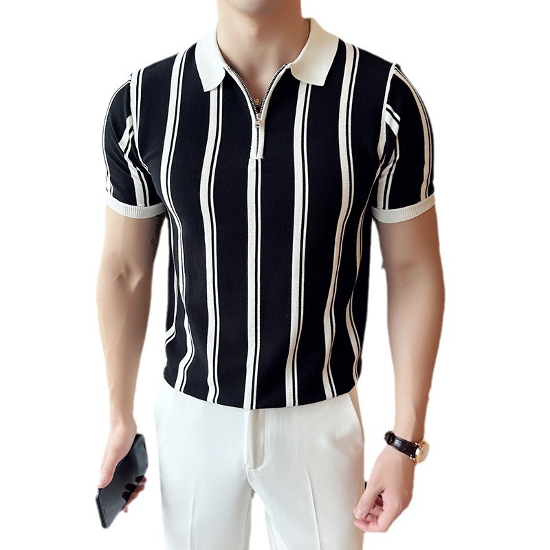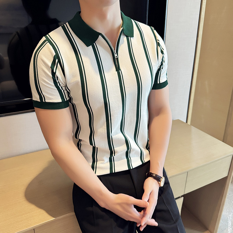 半拉链撞色条纹短袖POLO衫男夏季潮流轻熟雅痞修身翻领半袖体恤衫