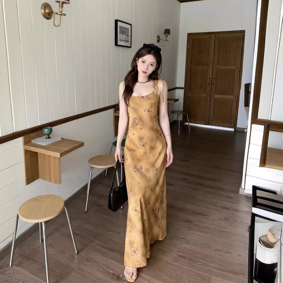 法式油画印花吊带连衣裙女夏季温柔设计感收腰度假长裙女小个子