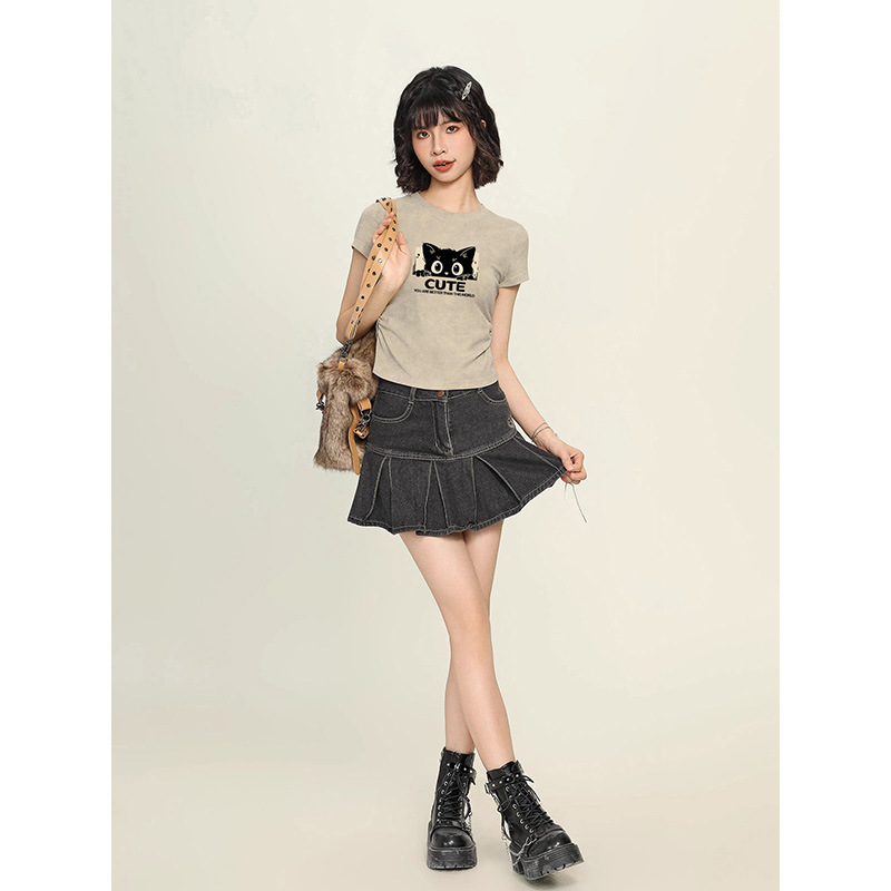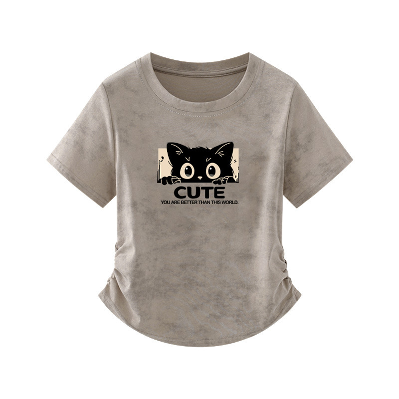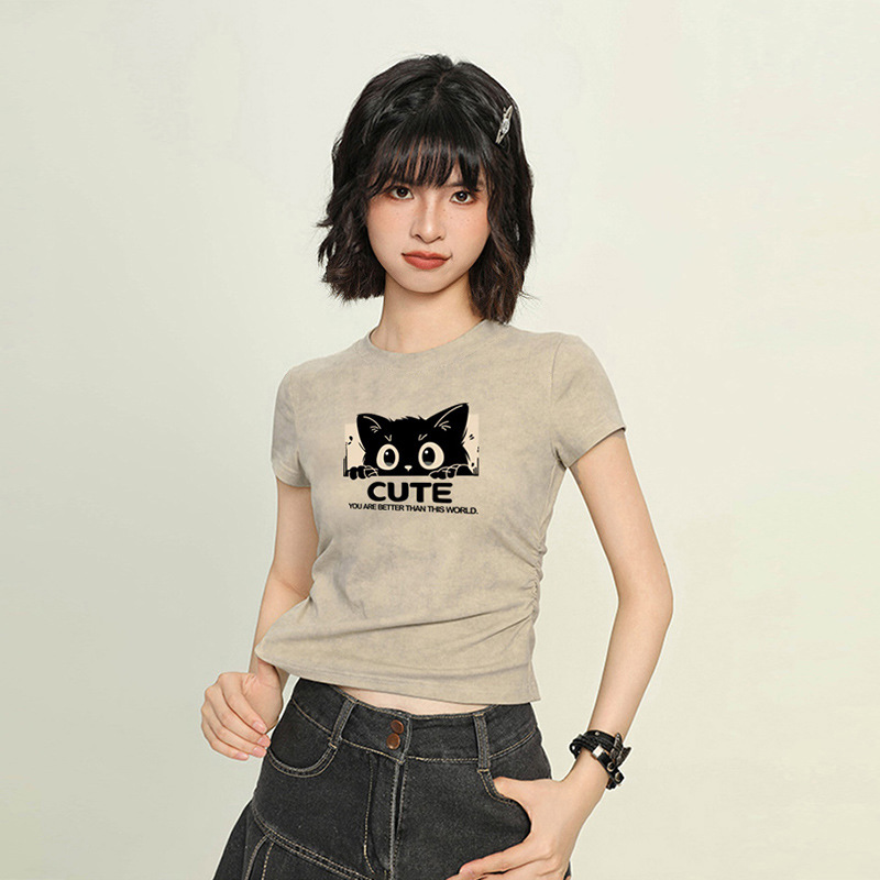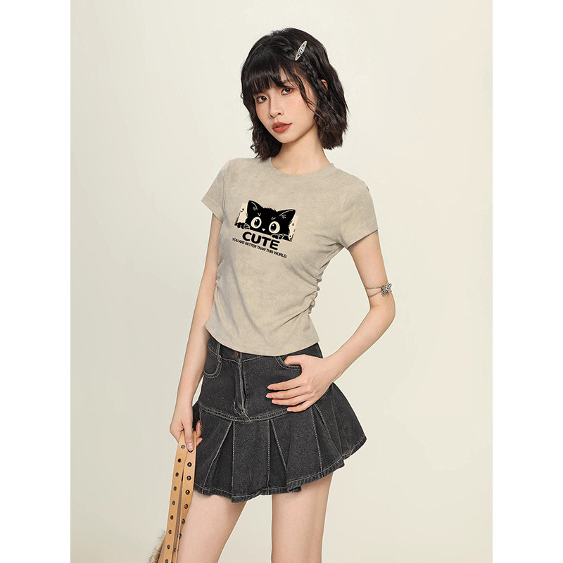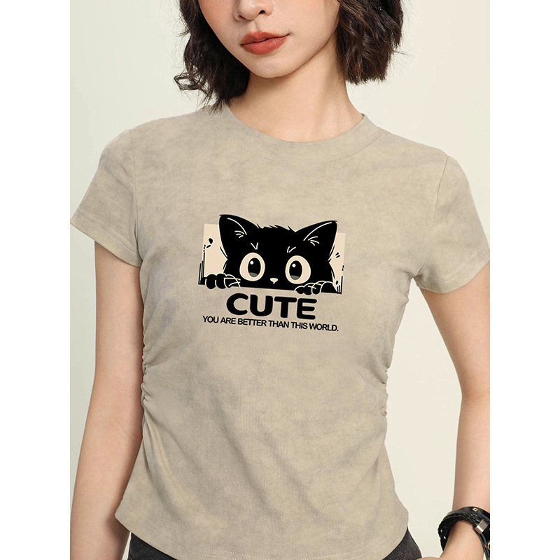 纯棉扎染别致正肩短袖T恤女夏季新款辣妹收腰褶皱ins大码短款上衣