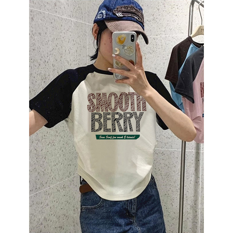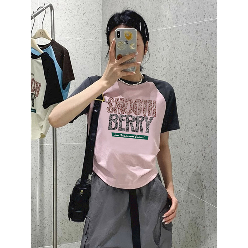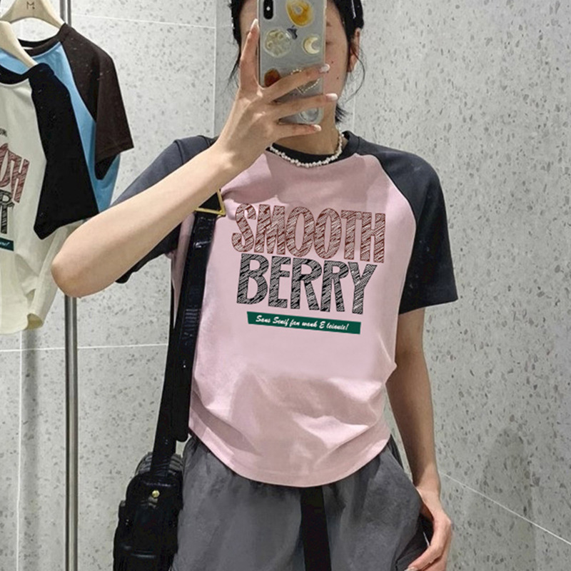 美式短袖夏季纯棉正肩短款t恤女装辣妹美式设计修身显瘦打底上衣