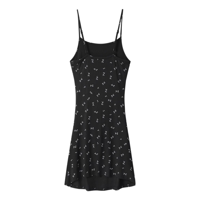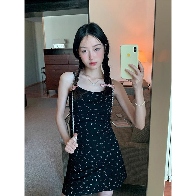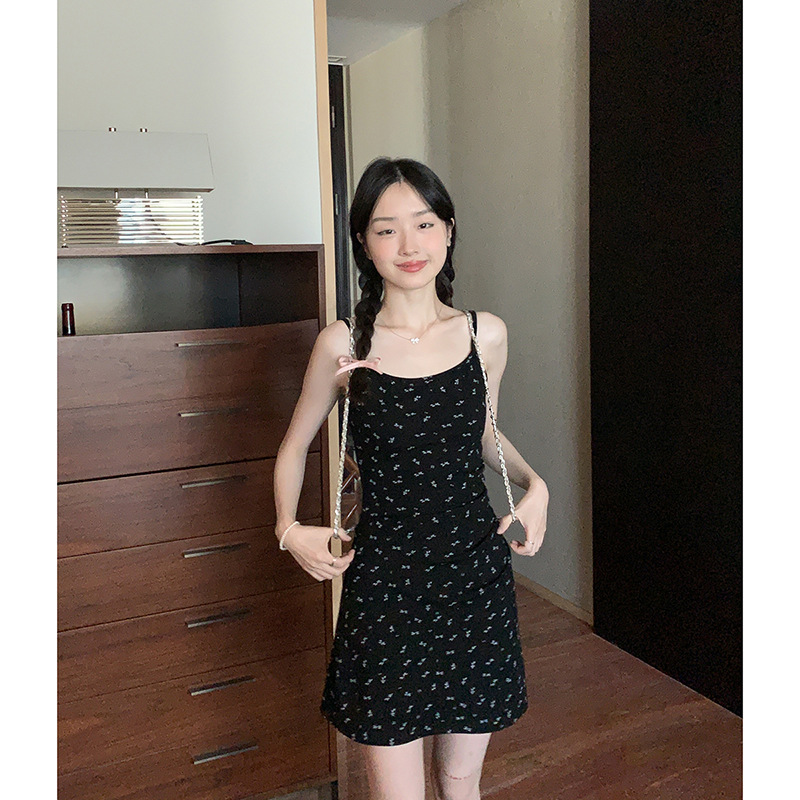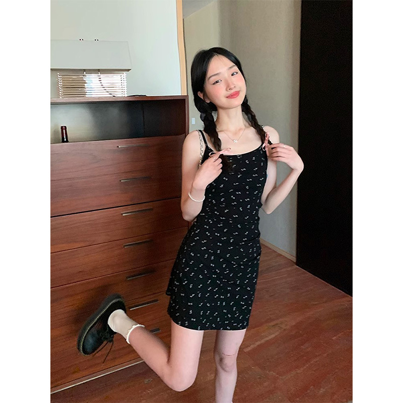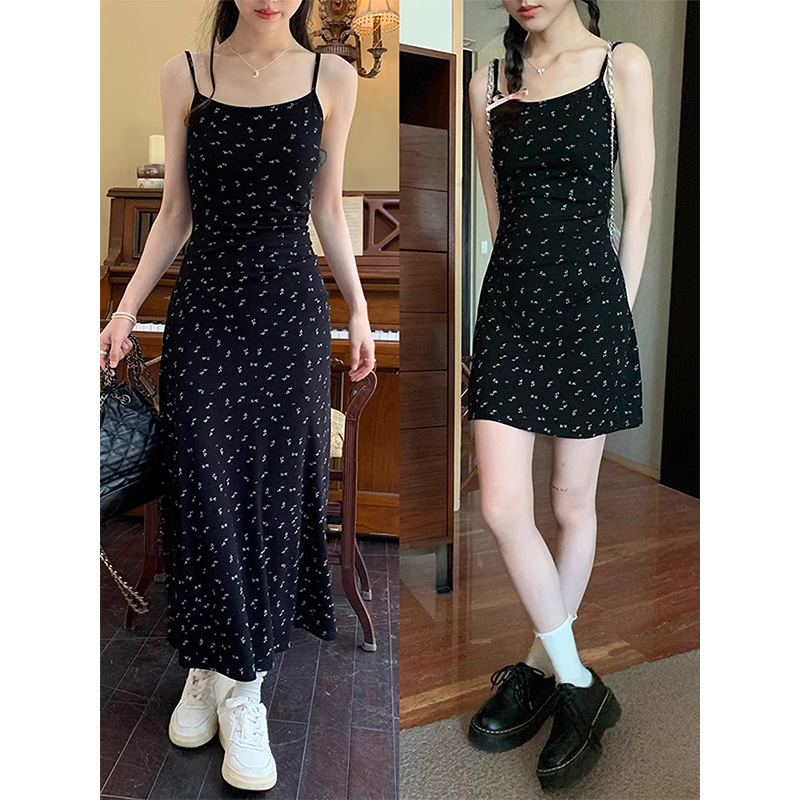 螺纹碎花中长款吊带裙女夏季新款茶系穿搭修身显瘦气质连衣裙