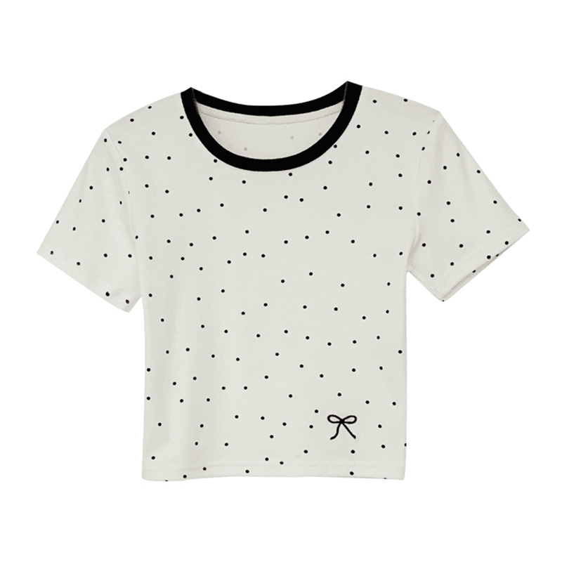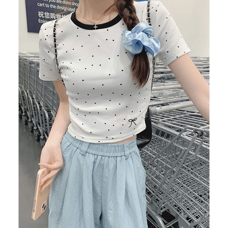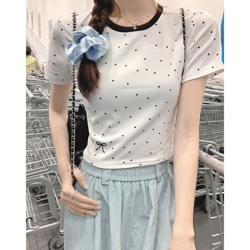 纯棉圆领撞色波点短袖正肩T恤夏刺绣蝴蝶结bm短款露脐修身上衣女