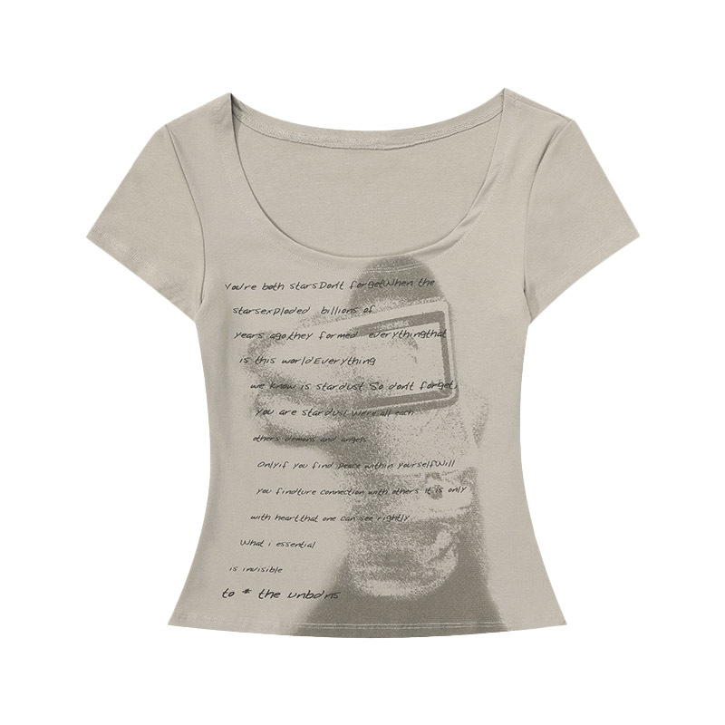 美式复古字母人像印花短袖t恤女夏季修身显瘦甜辣妹正肩短款上衣