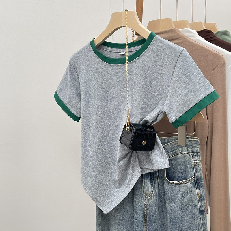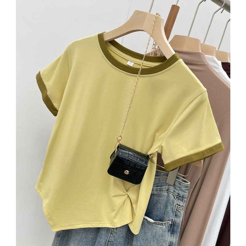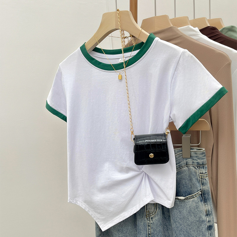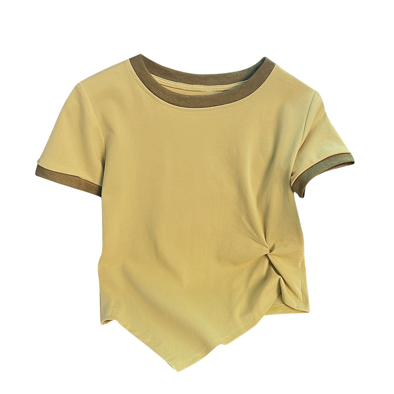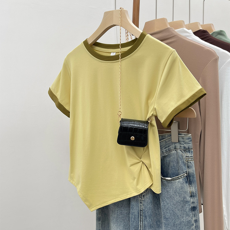 纯棉正肩短袖T恤女夏季新款不规则别致设计感小个子短款撞色上衣