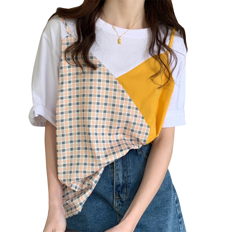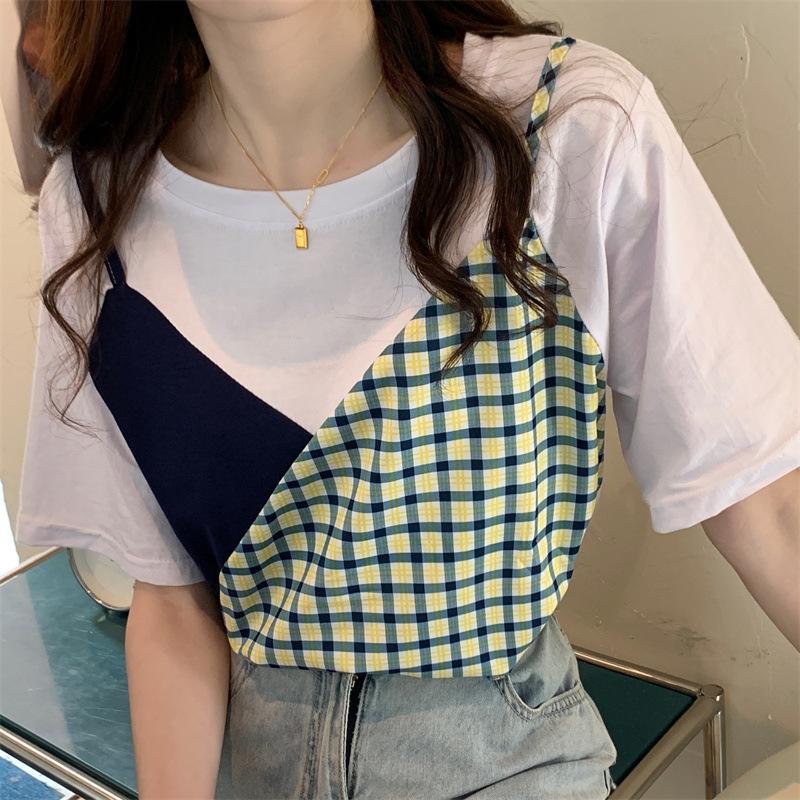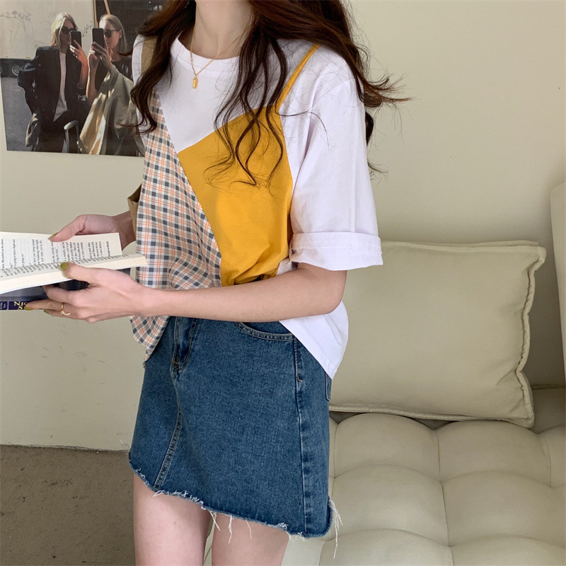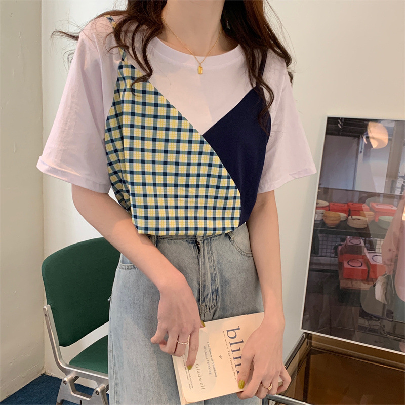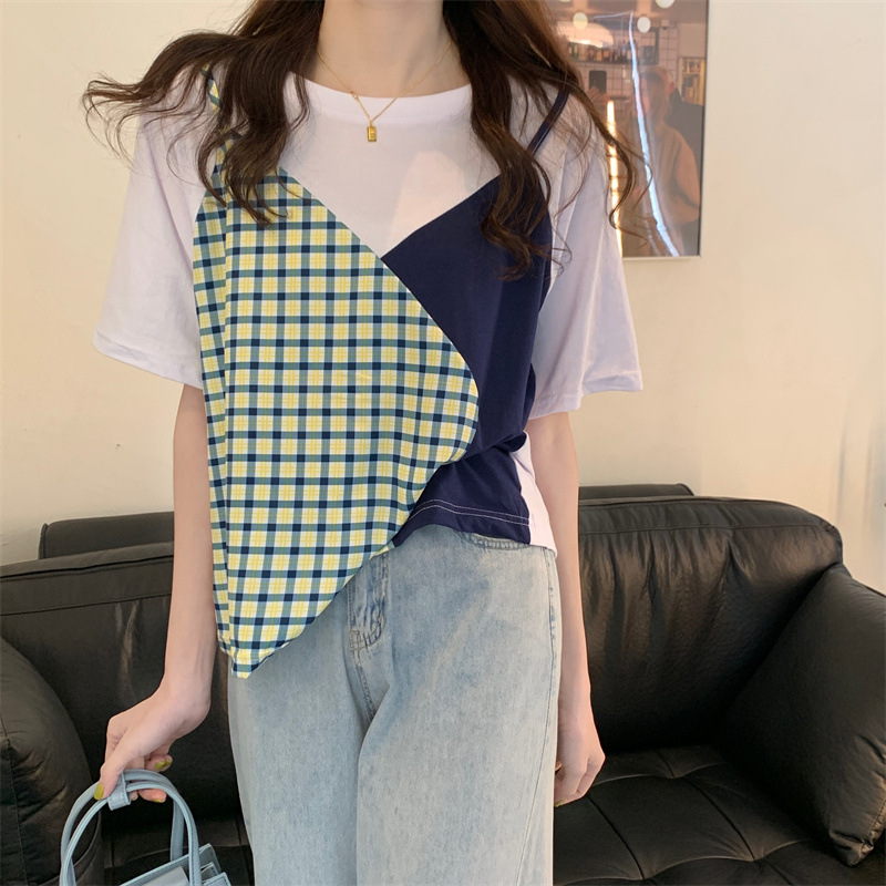 纯棉年夏季拼接格子短袖t恤女设计感小众上衣别致宽松百搭ins