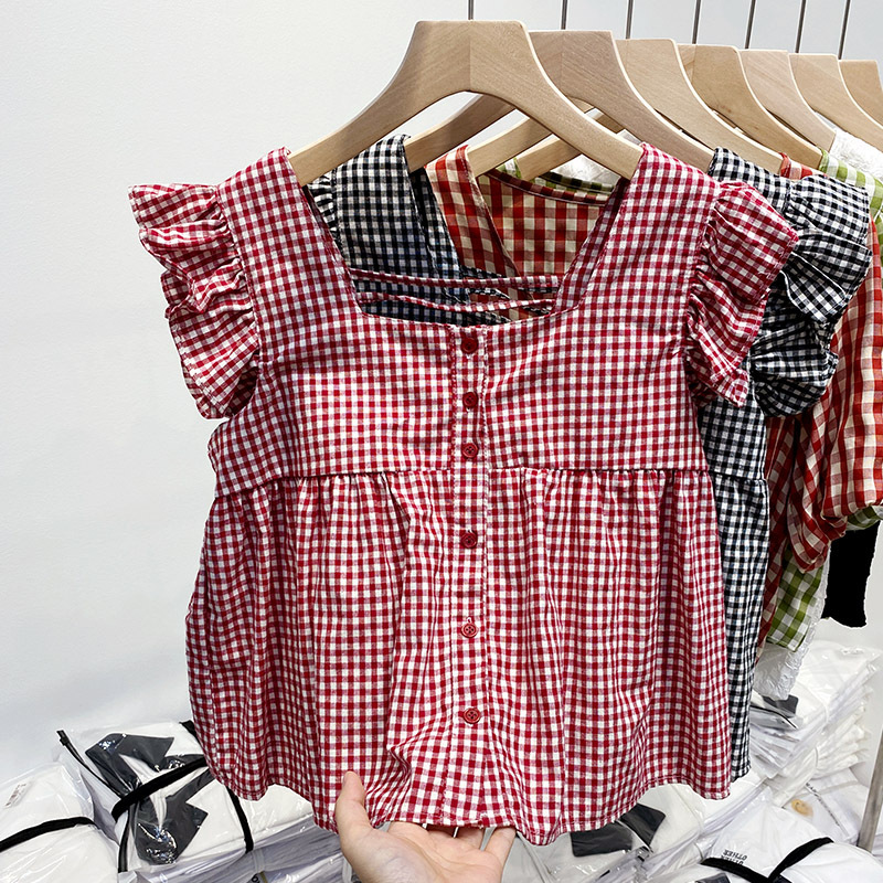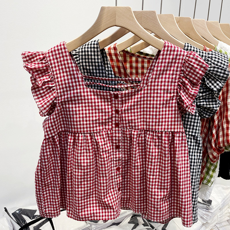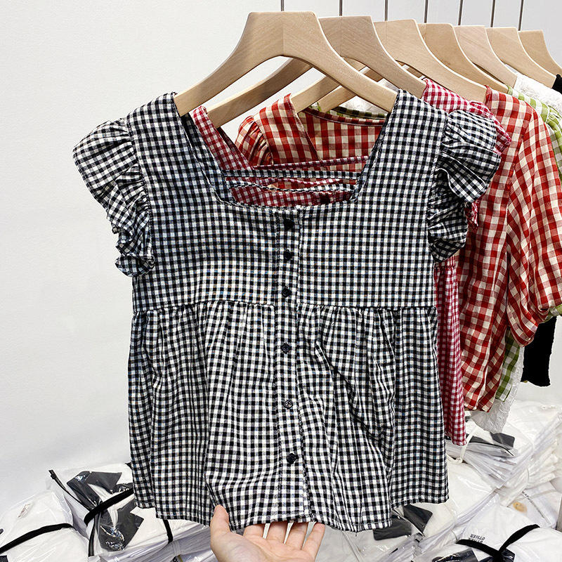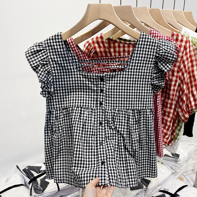 法式格子小飞袖衬衫女夏季新款设计感小众衬衣宽松小个子短款上衣