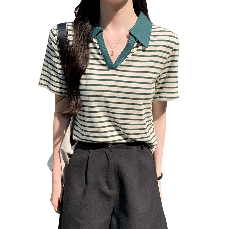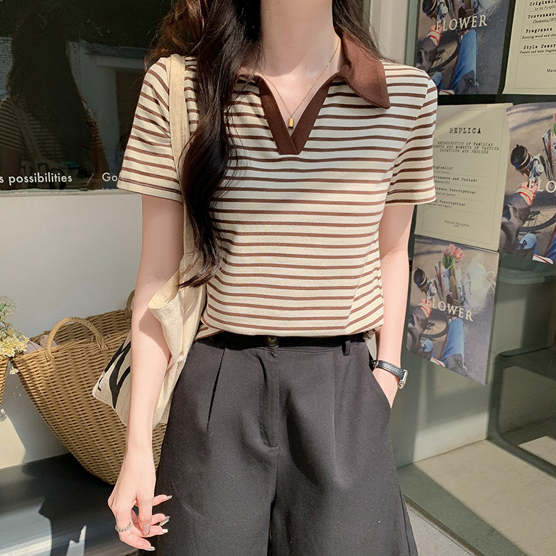 纯棉正肩t恤女短袖夏季设计感美式复古polo领条纹修身显瘦上衣服