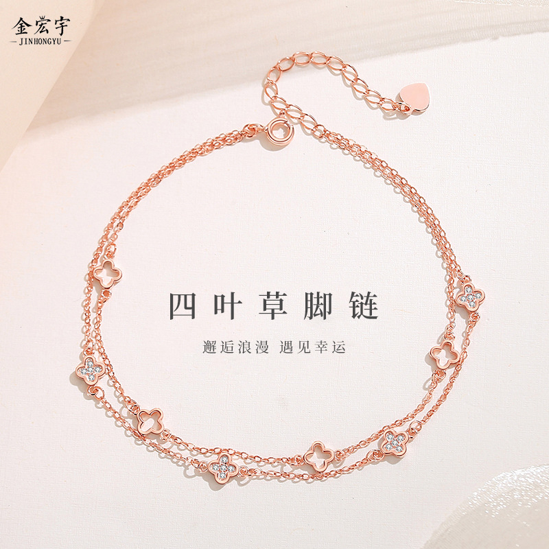 金宏宇双层四叶草脚链女纯银ins森系玫瑰金轻奢高级感气质脚饰品