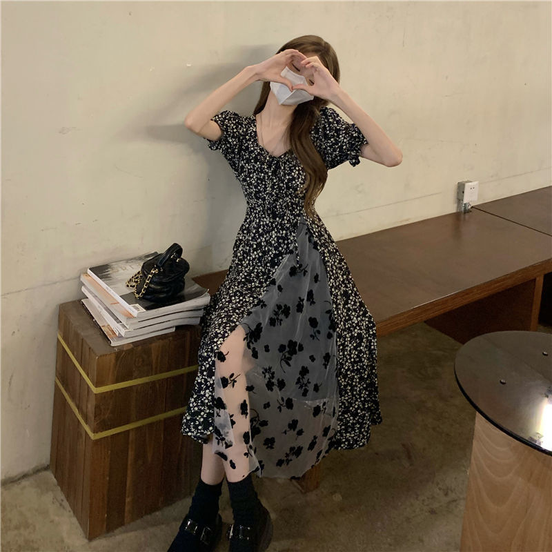 碎花方领连衣裙女春夏新款法式复古设计感网纱拼接中长款裙子