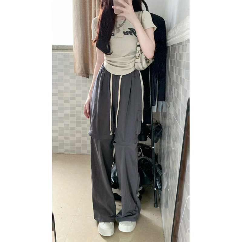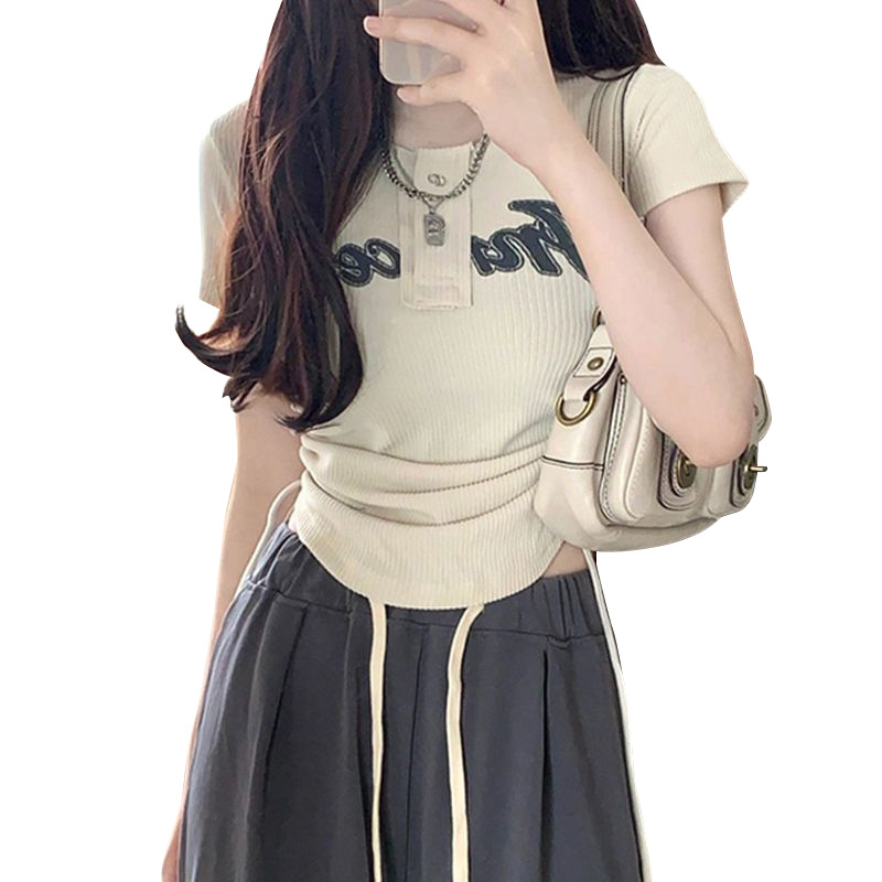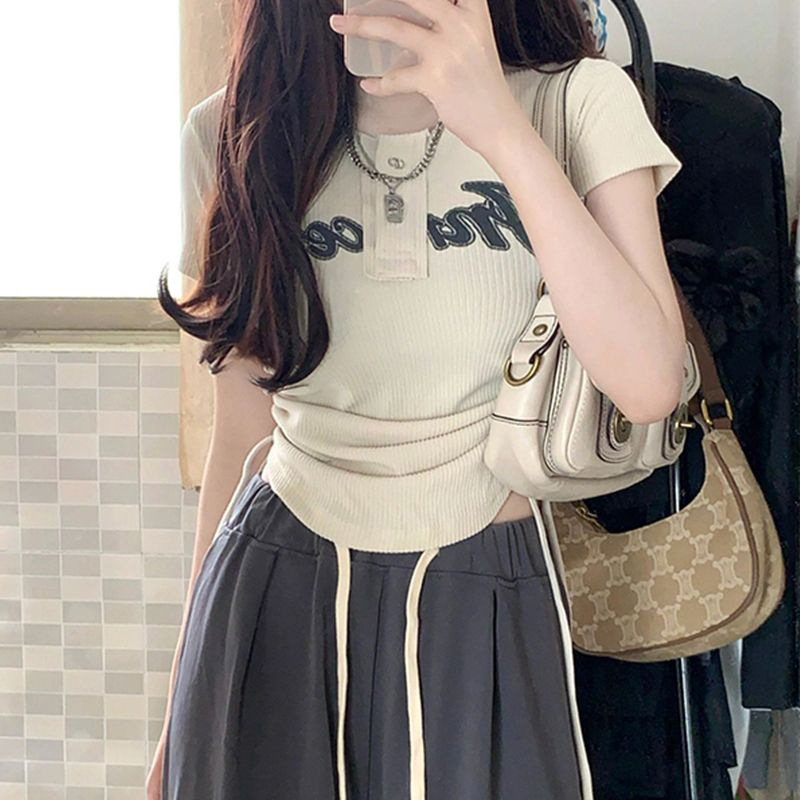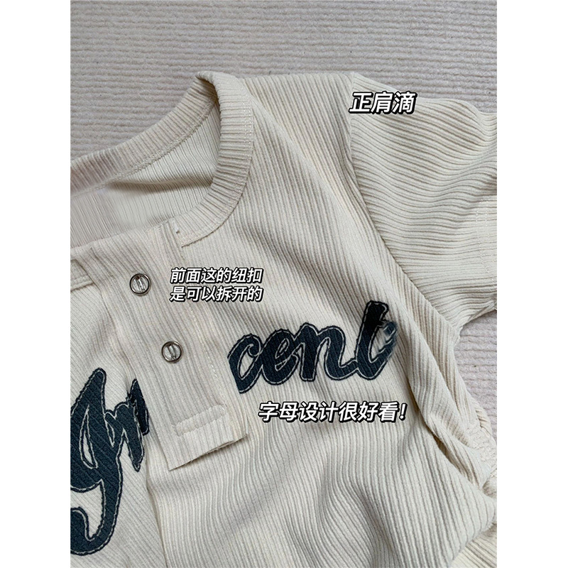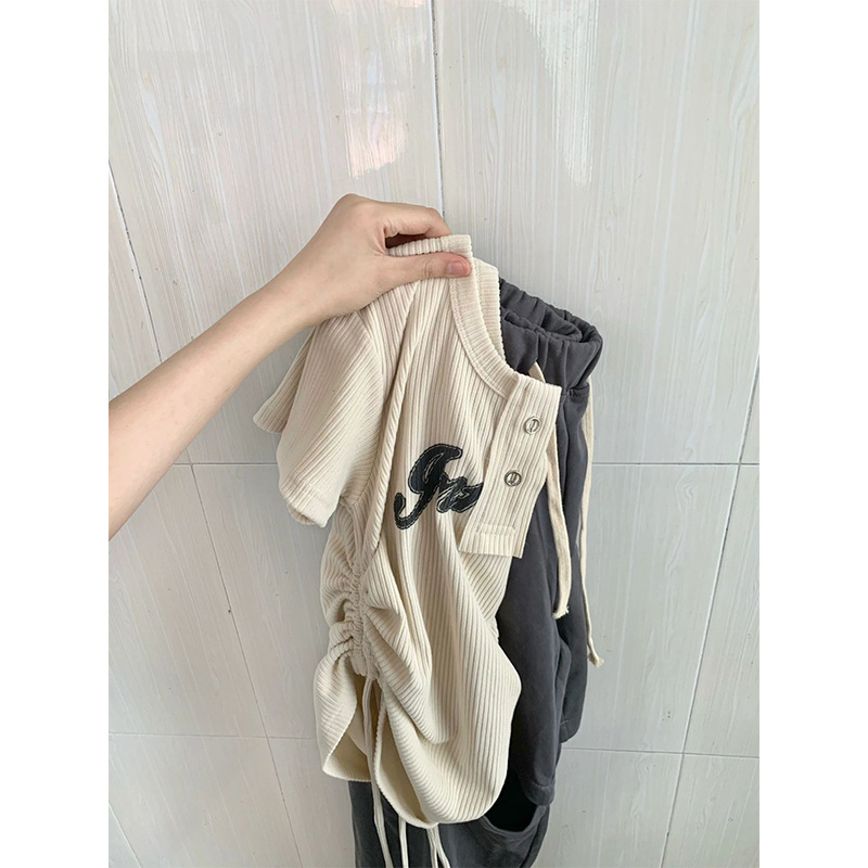 正肩短袖t恤女夏季新款抽绳美式复古辣妹短款纯欲上衣设计感