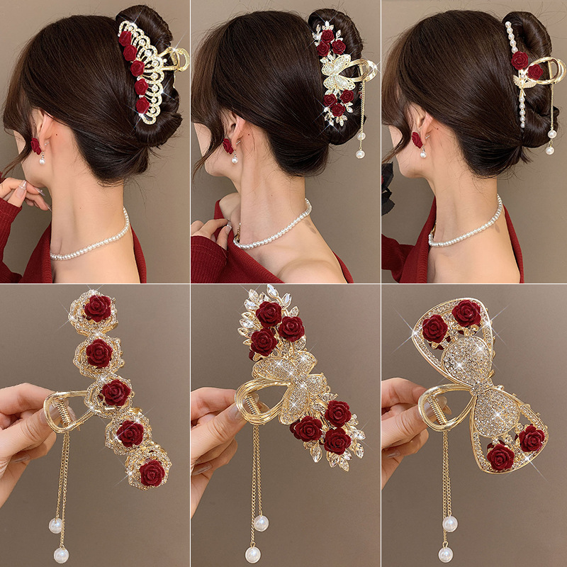 玫瑰花抓夹丝绒气质后脑勺发夹女生鲨鱼夹金属夹子高级感大号发饰