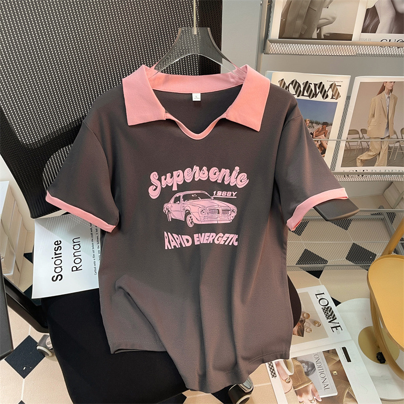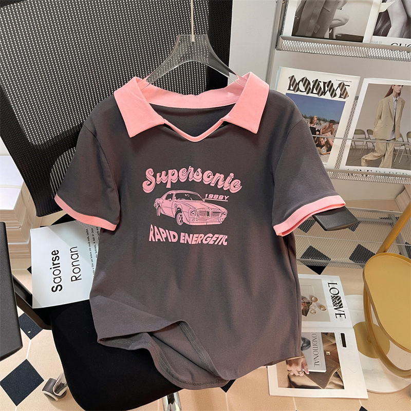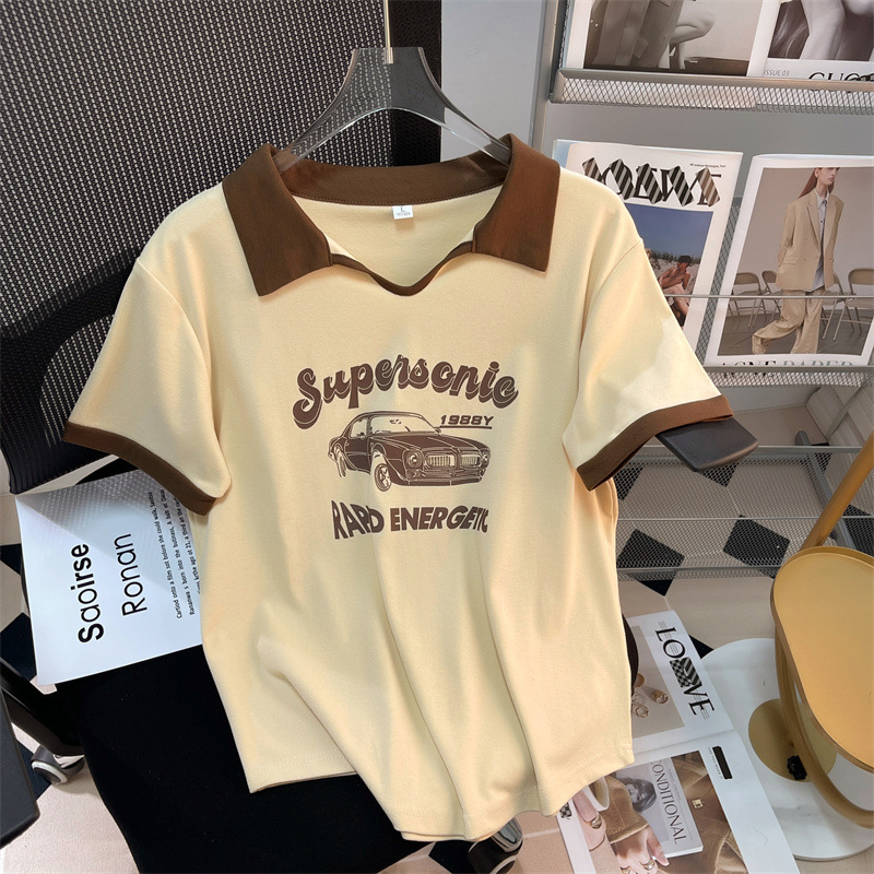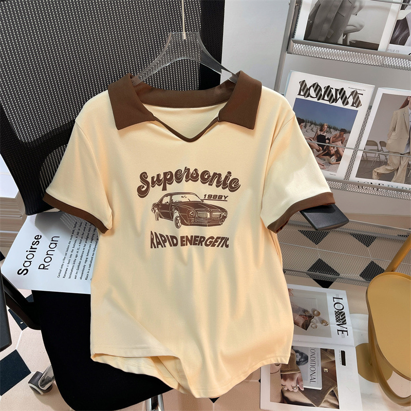 纯棉设计感小众撞色短袖t恤女新款夏季宽松正肩不规则上衣服