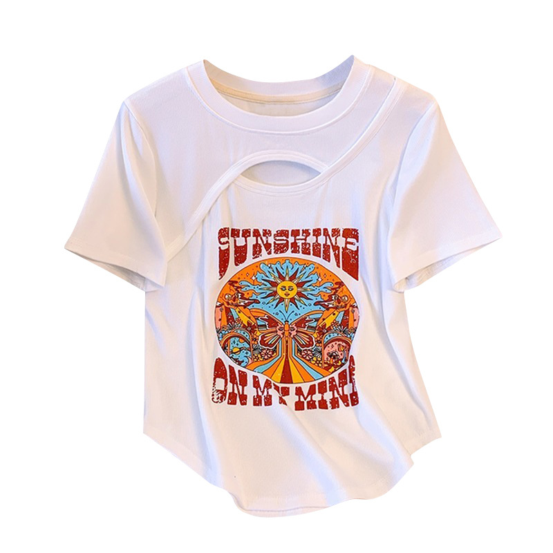 白色圆领正肩短袖T恤女夏紧身字母印花设计感小个子别致短款上衣