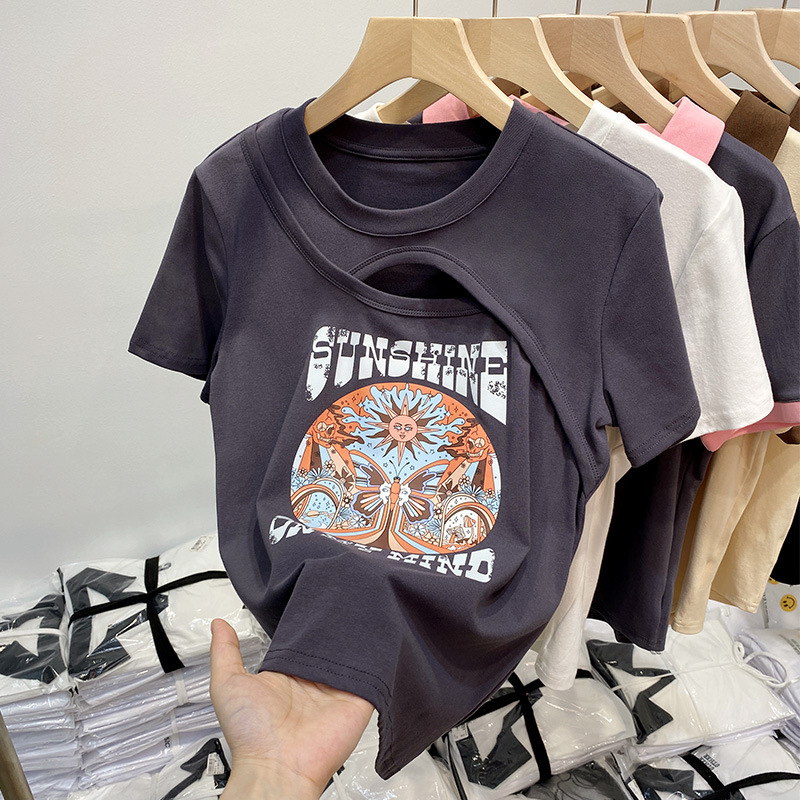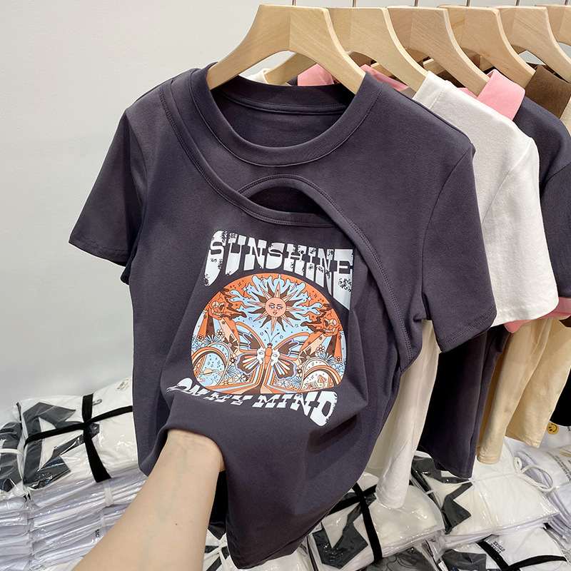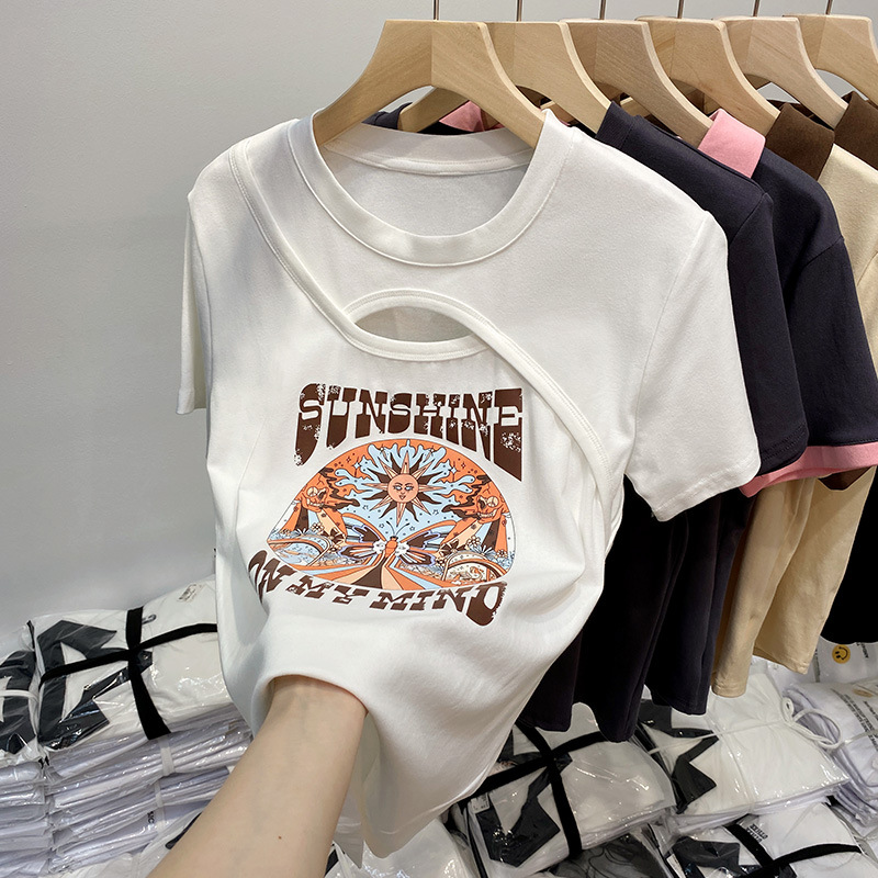 纯棉镂空短袖T恤女夏装新款设计感小众正肩半袖港味chic上衣