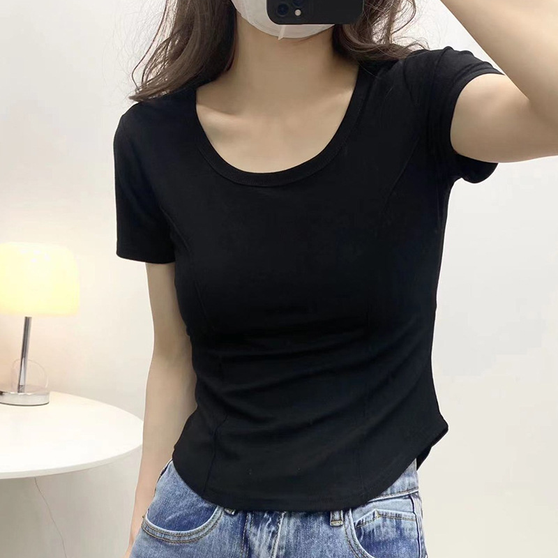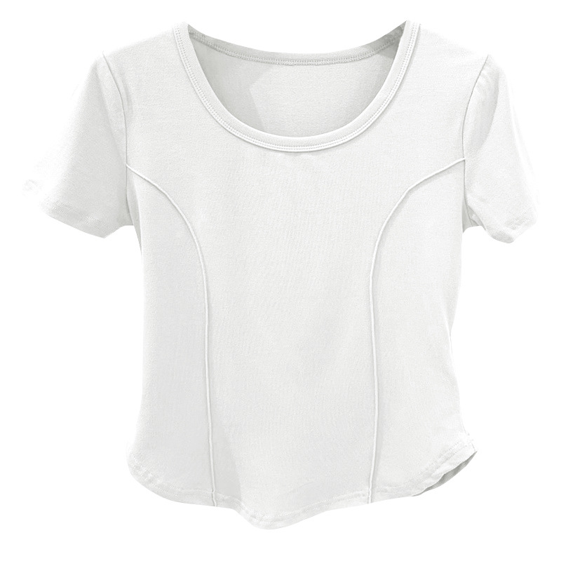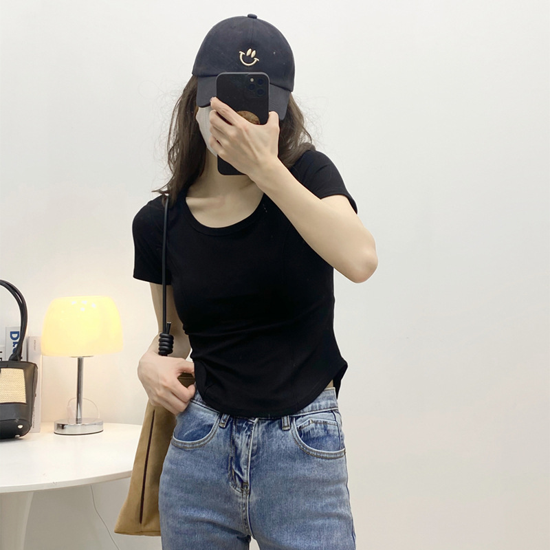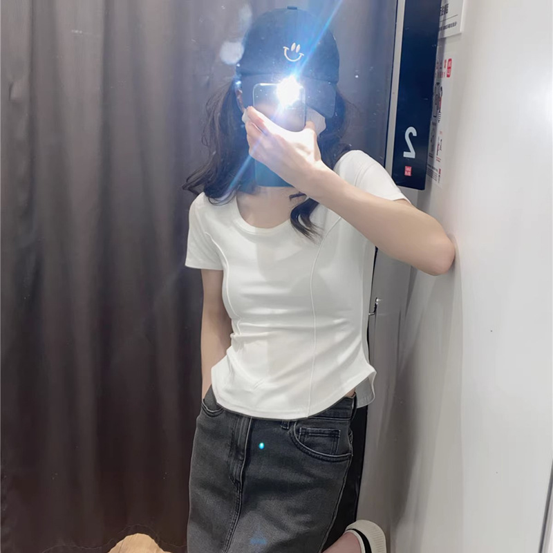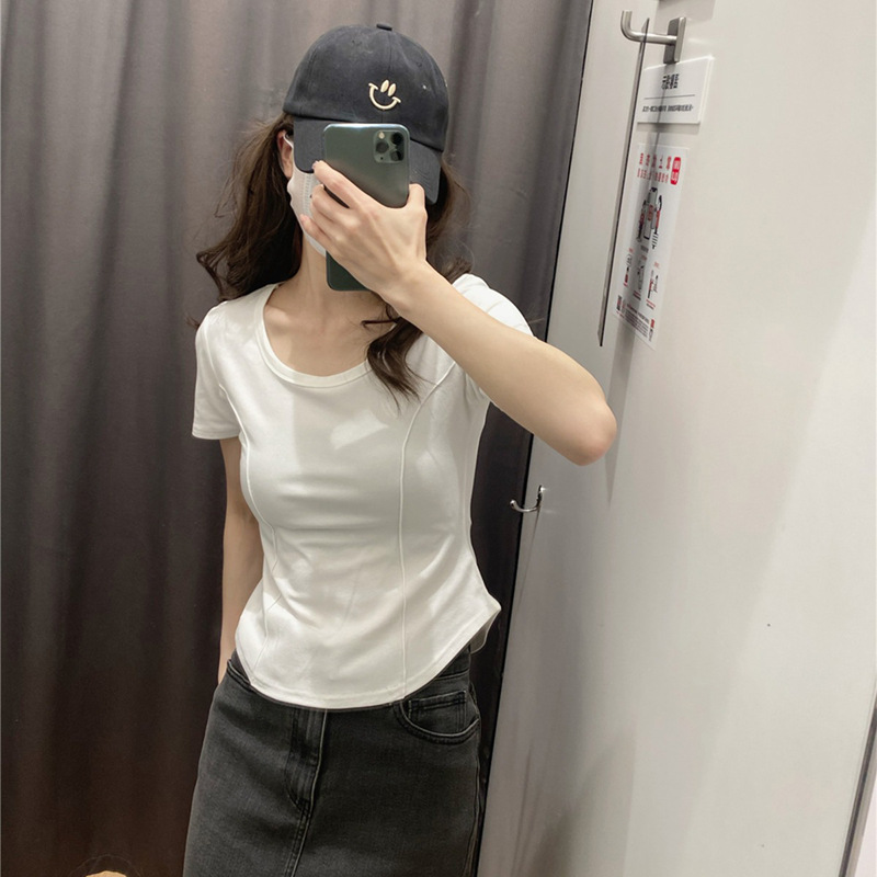 纯棉正肩白色短款紧身掐腰鱼骨短袖t恤女夏季高级感圆弧下摆上衣