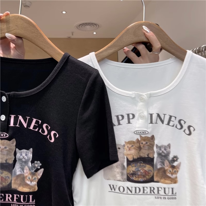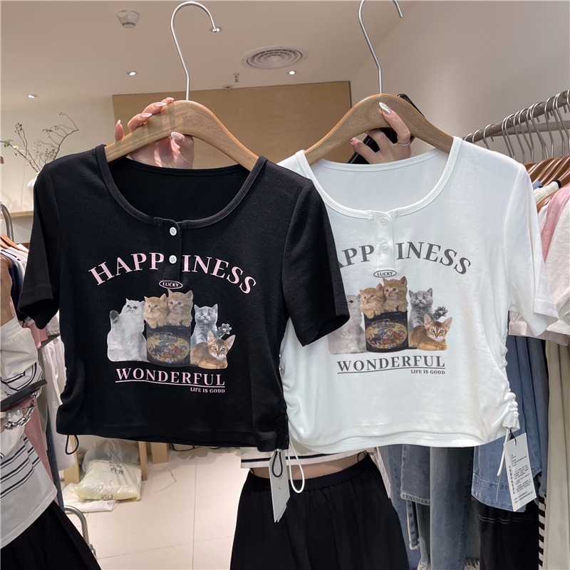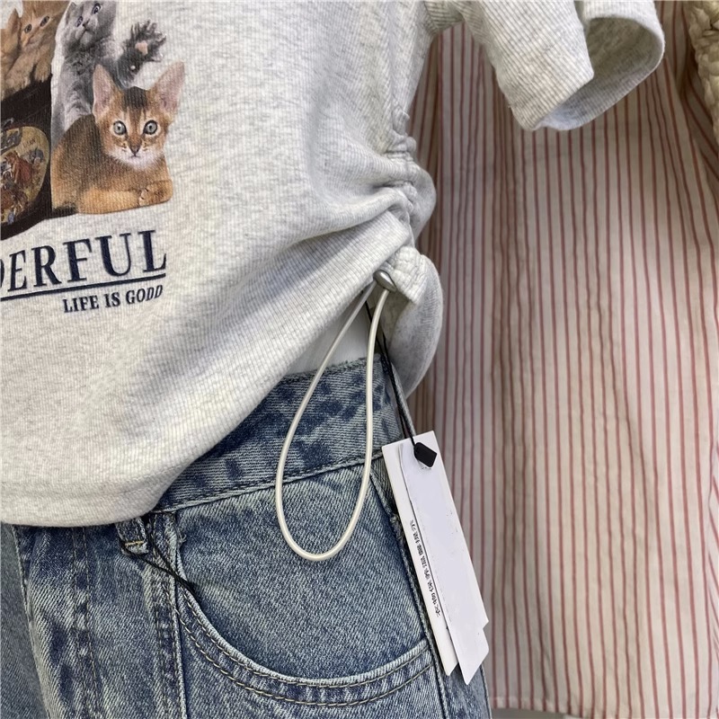 韩系港风印花半袖t恤女宽松夏季短款抽绳上衣独特设计感洋气小衫
