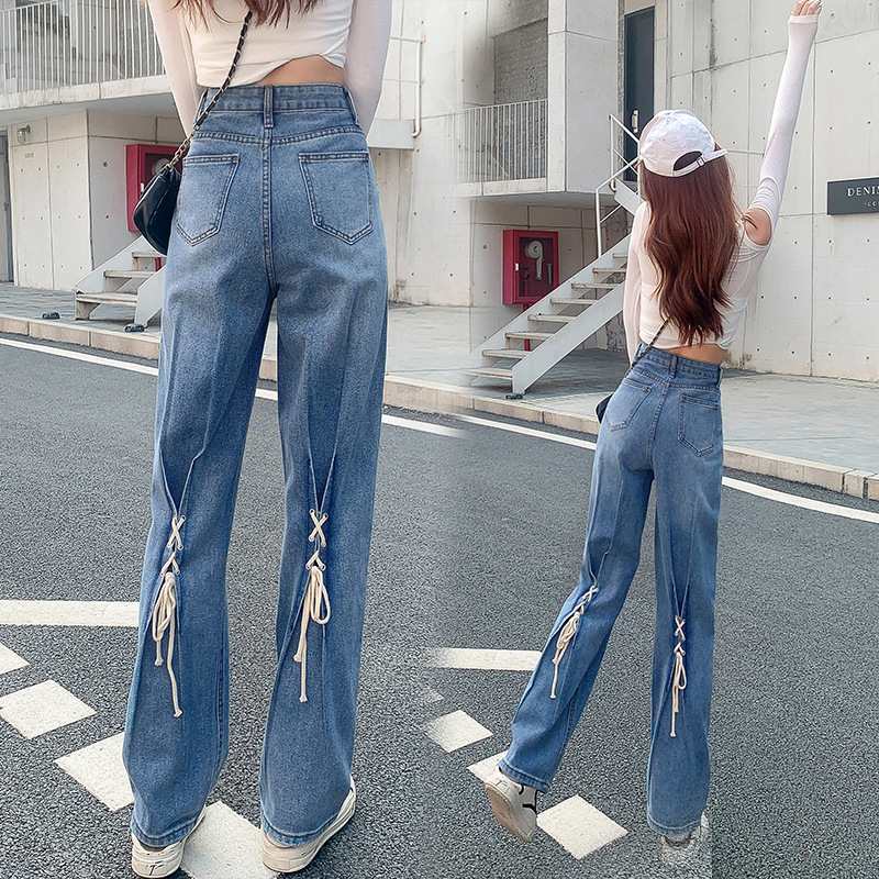 绑带拖地牛仔裤女秋新款高腰显瘦显高设计感小众直筒阔腿长裤