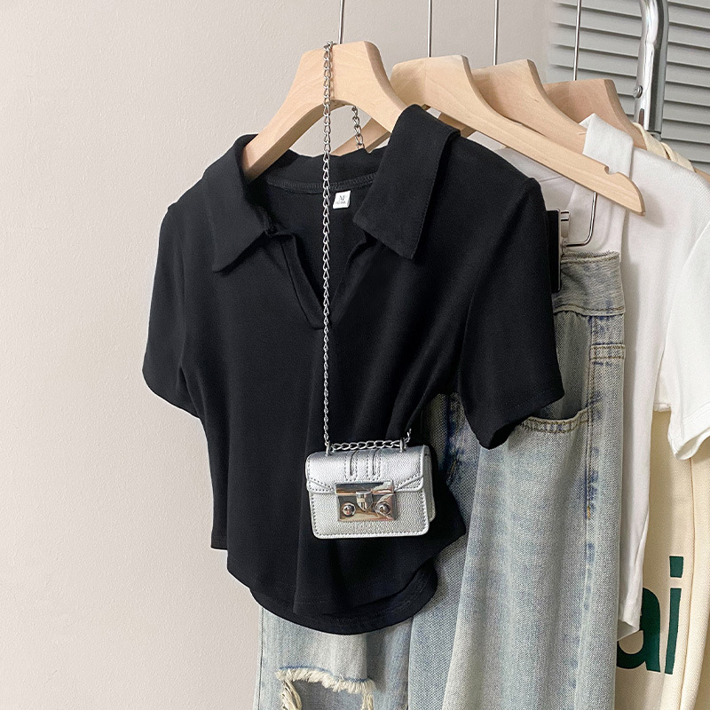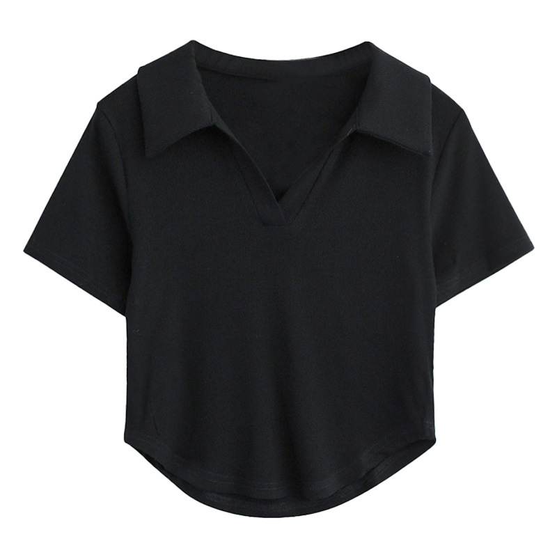 黑色polo领正肩短袖t恤女夏季大码胖妹妹显瘦百搭不规则上衣V领