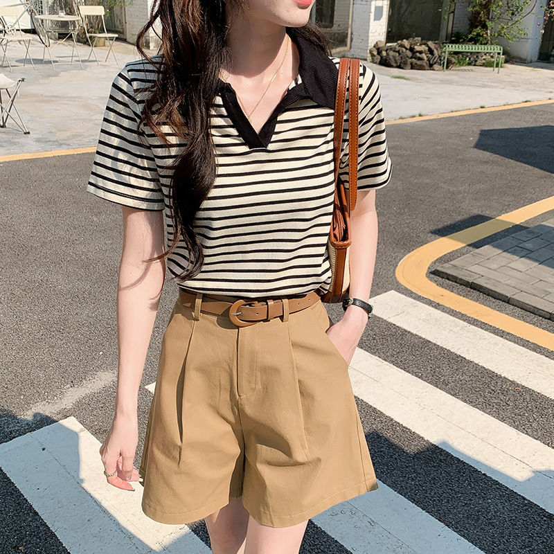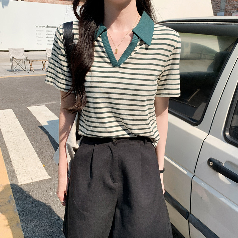 纯棉正肩t恤女短袖夏季别致小众美式复古polo领条纹百搭上衣