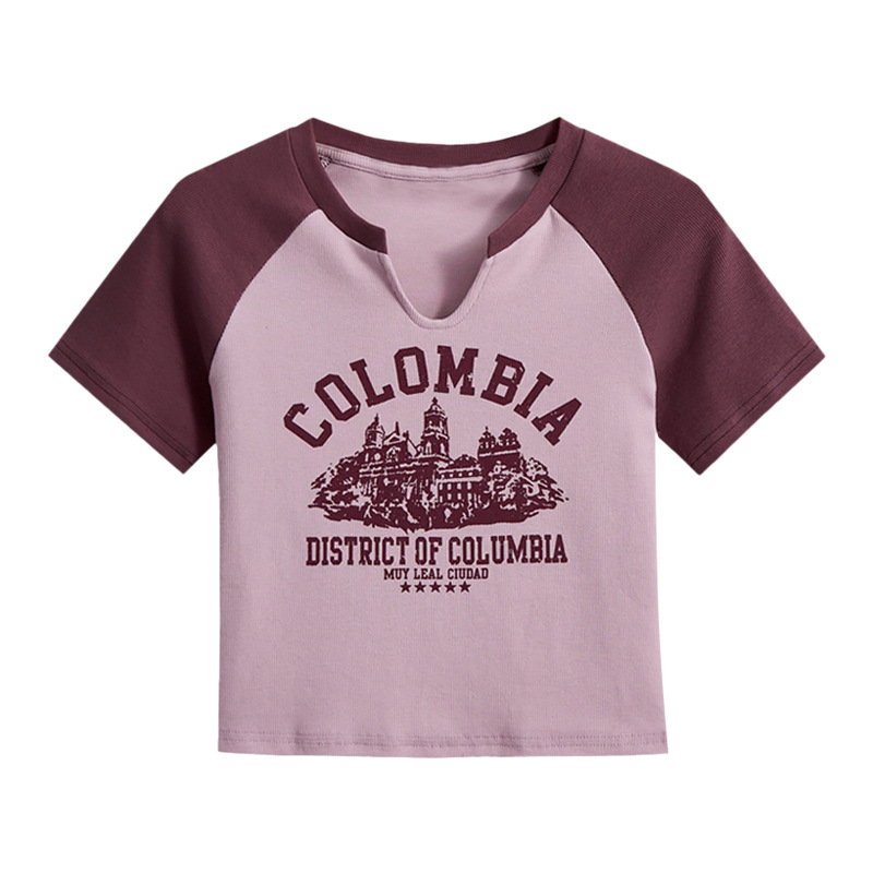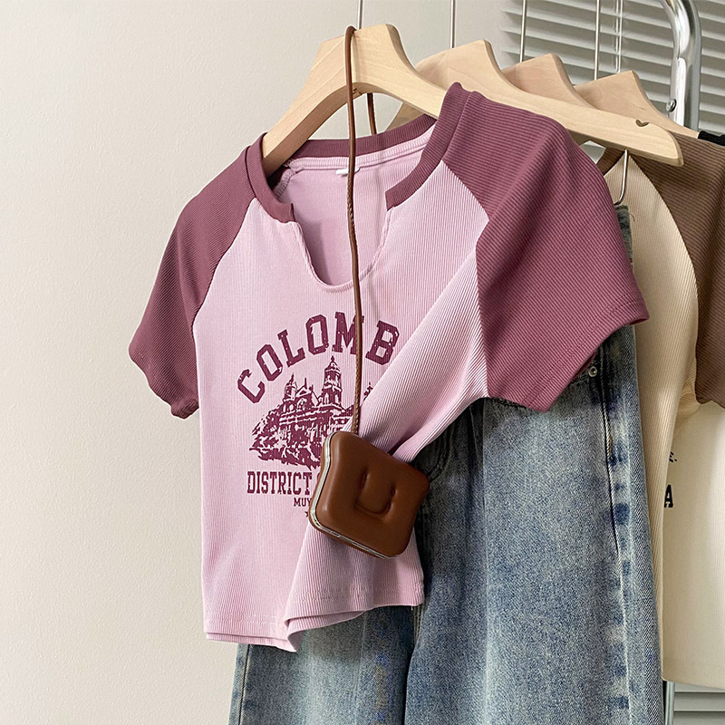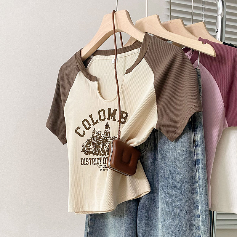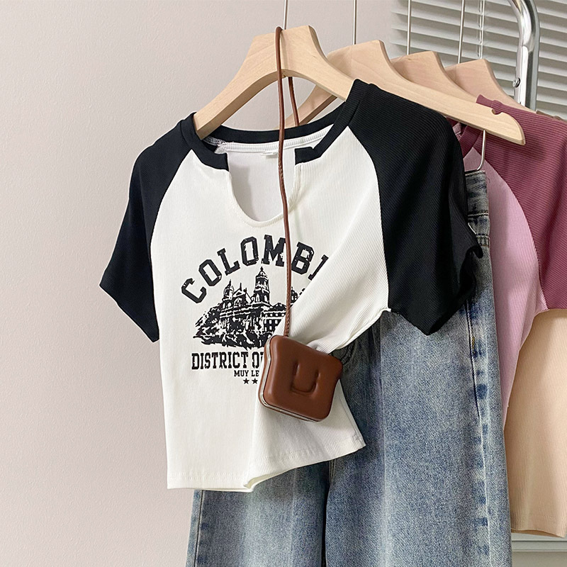 美式辣妹拼色插肩袖V领短袖T恤夏季新款女装百搭字母印花上衣