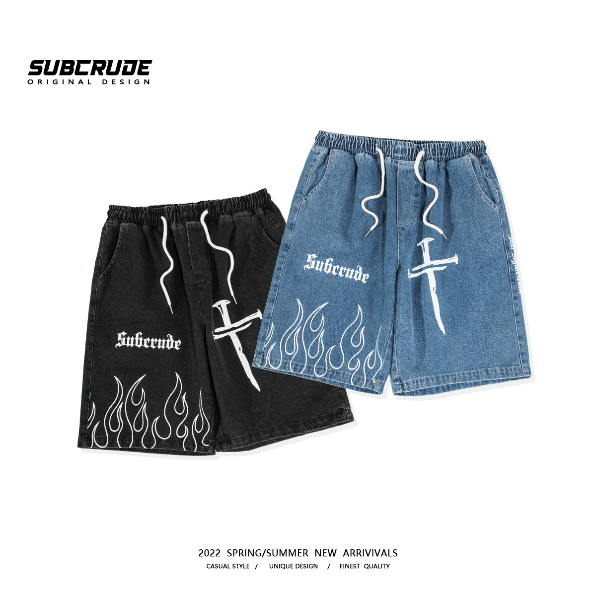 潮牌高街裤子设计感印花牛仔短裤男夏季欧美复古宽松阔腿五分裤子