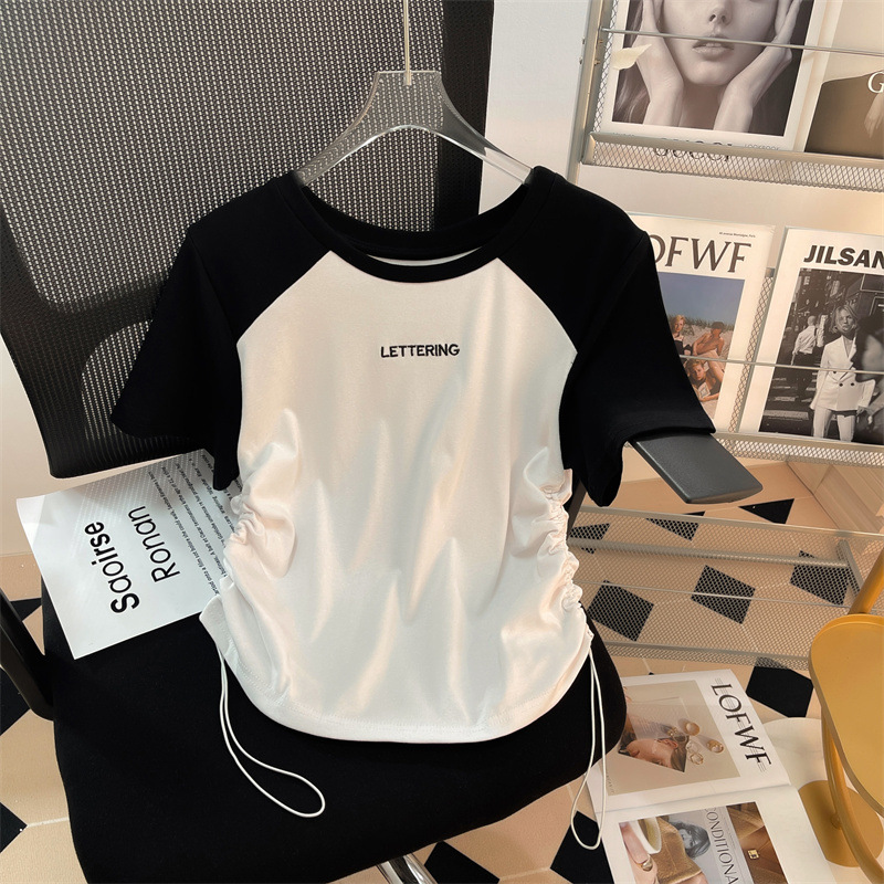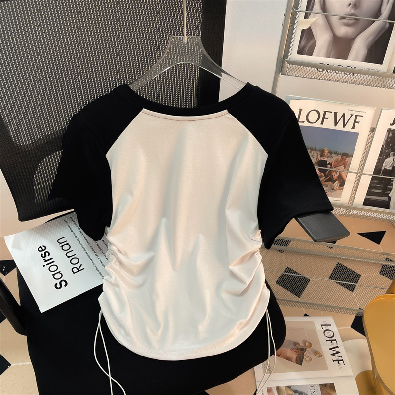 纯棉美式复古撞色插肩袖t恤女夏季新款修身收腰抽绳设计感上衣潮