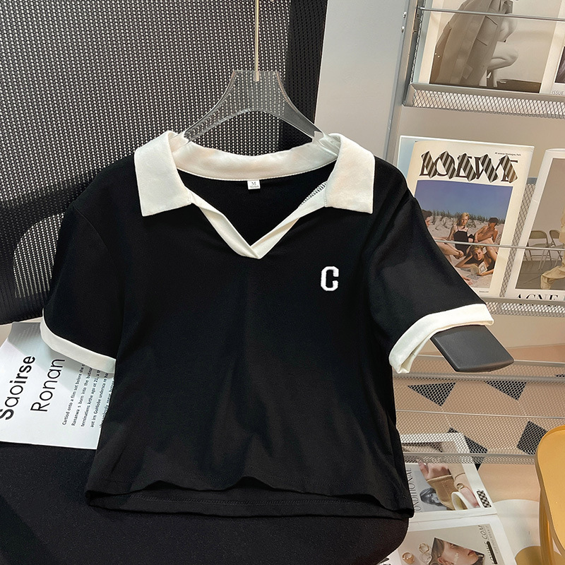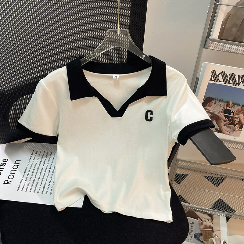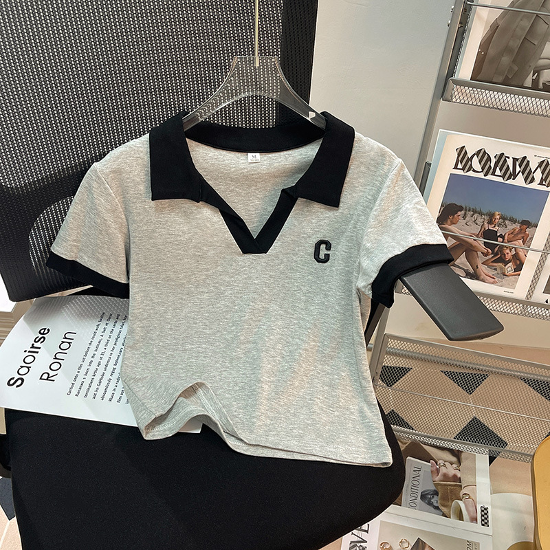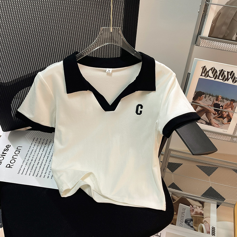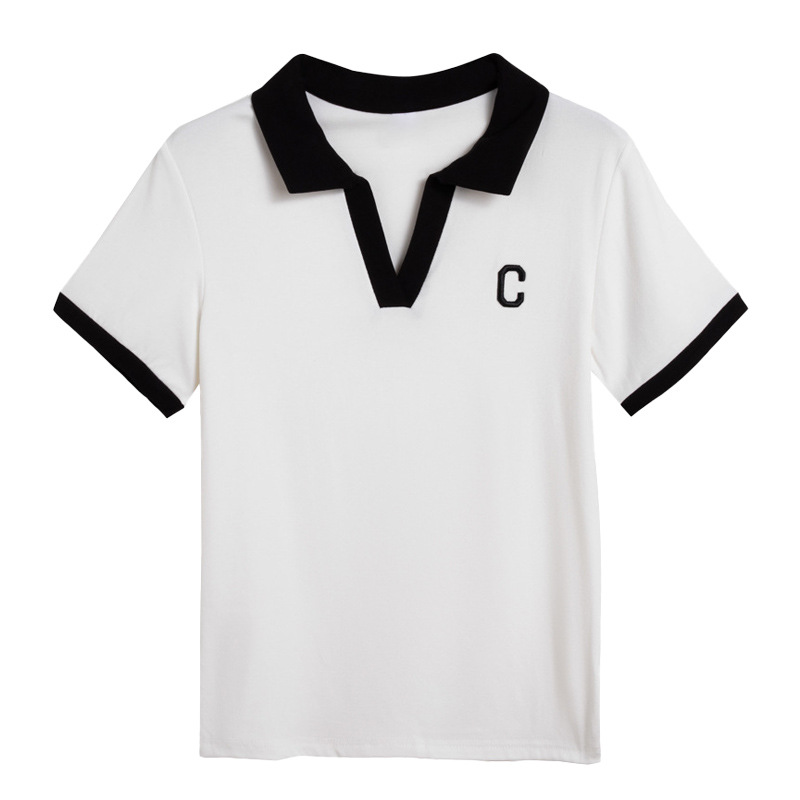 新款V领正肩锁骨t恤女韩版polo领撞色刺绣百搭胖mm短袖上衣夏