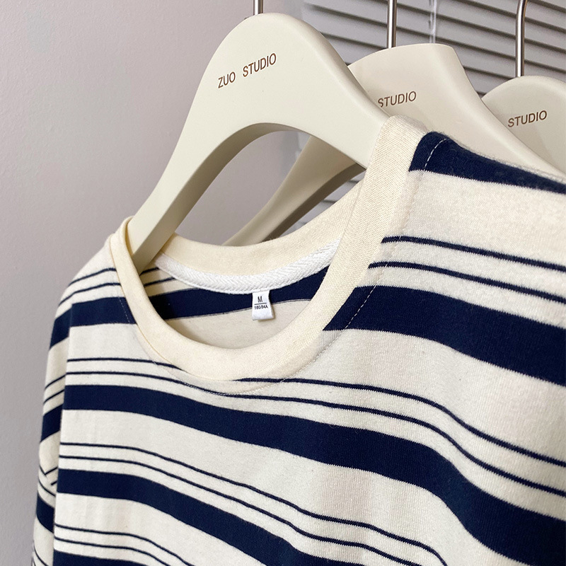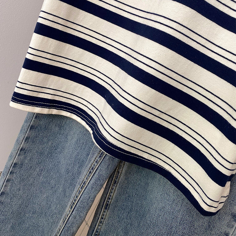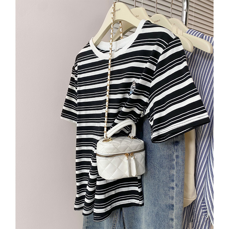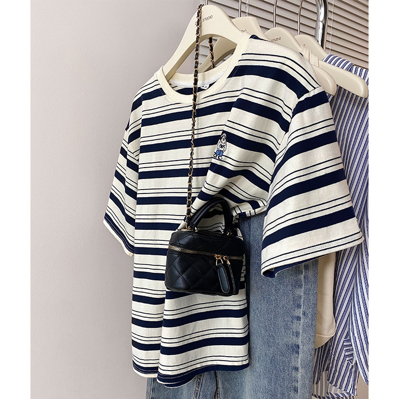纯棉复古风减龄条纹短袖t恤女夏季新款宽松显瘦刺绣休闲上衣