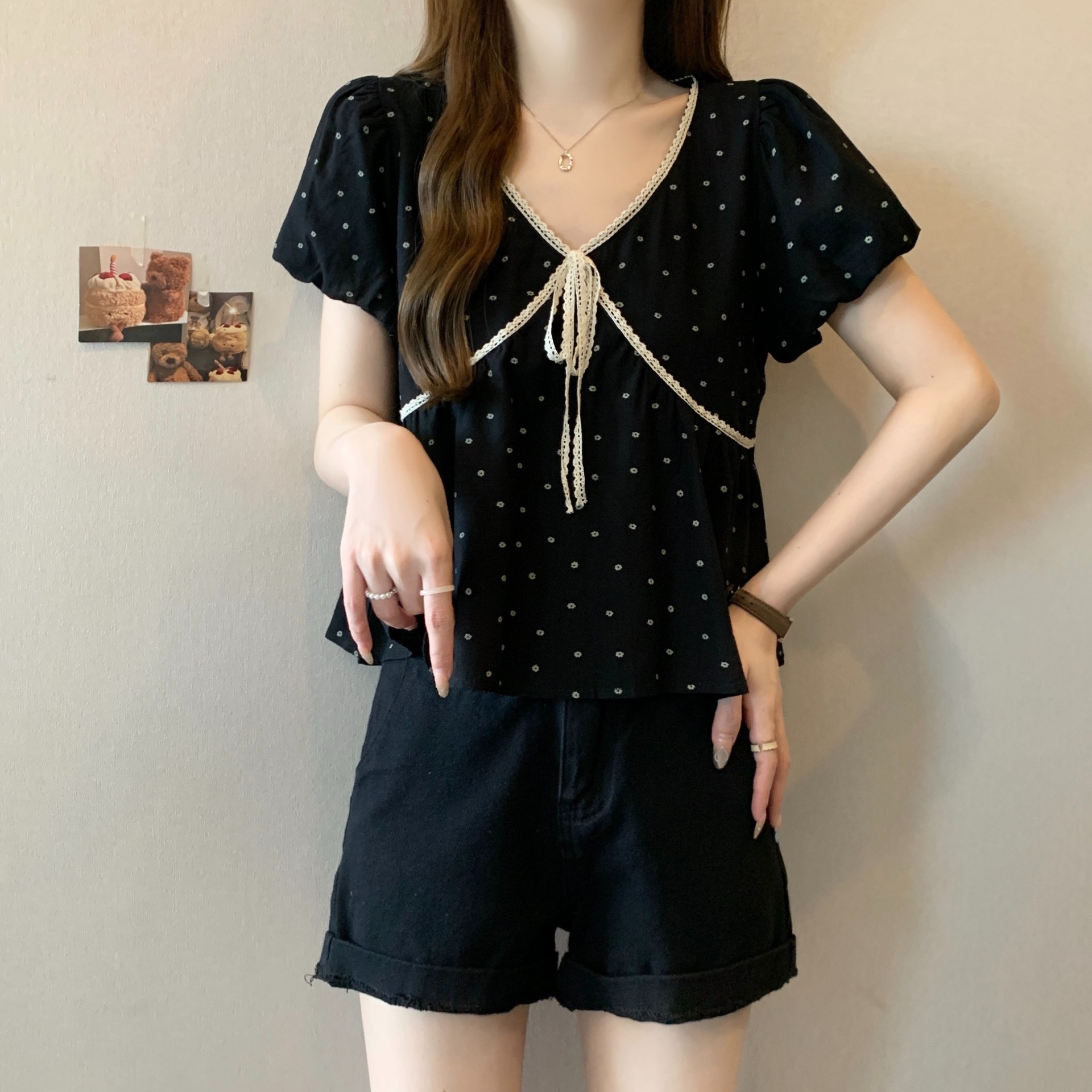 法式蕾丝边碎花泡泡袖雪纺衫女夏大码胖MM黑色娃娃衫宽松显瘦上衣