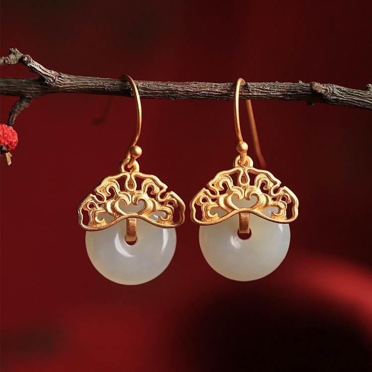 纯银古法金镶和田玉平安扣中国风复古宫廷气质耳环耳坠耳饰