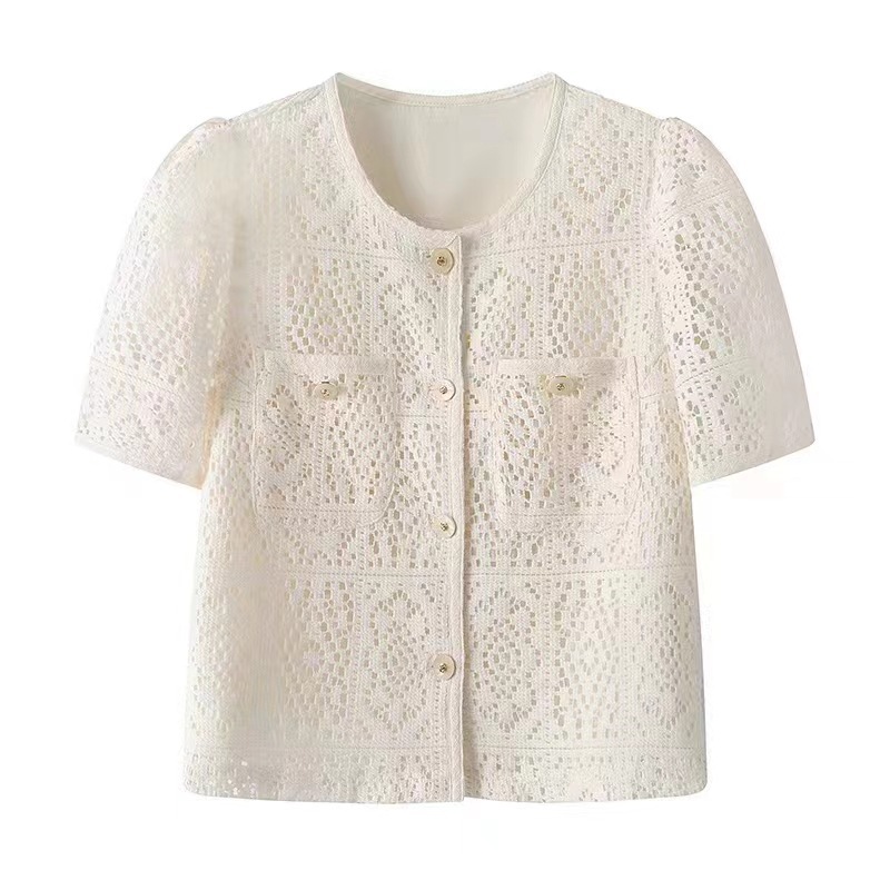 夏季新款蕾丝短袖小衫上衣圆领泡泡袖薄款短款女