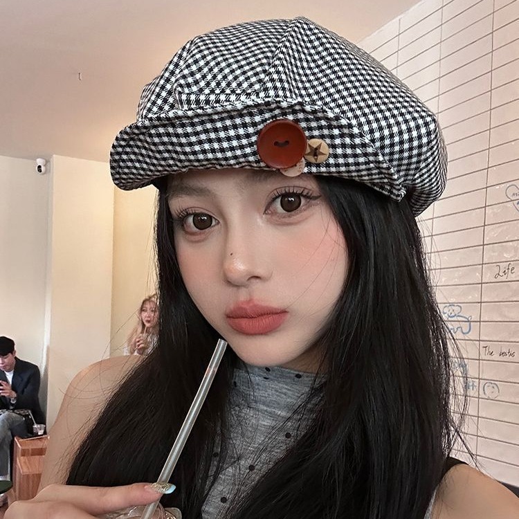韩版y2k手工纽扣贝雷帽女格子显脸小云朵帽子复古百搭文艺画家帽