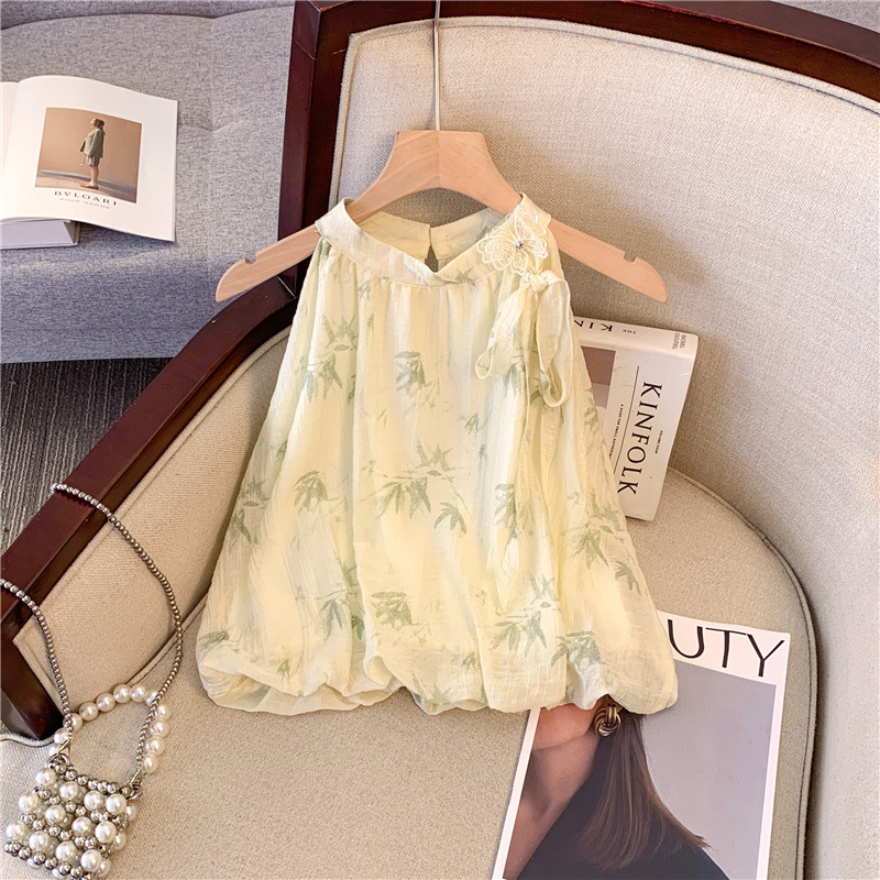 复古竹叶印花蝴蝶挂脖绑带雪纺衬衫女夏纯欲露肩小衫无袖花苞上衣