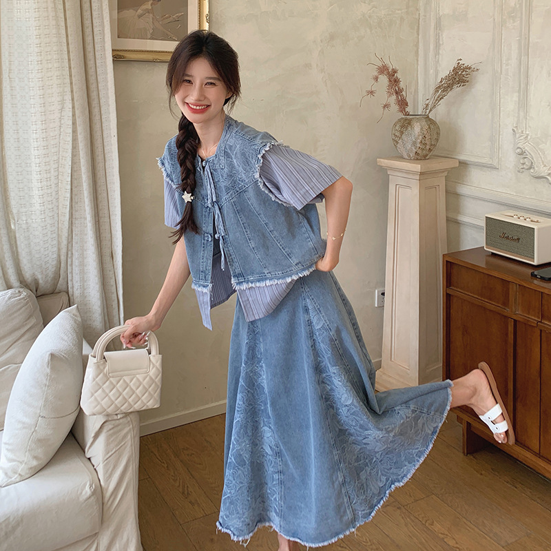 设计感假两件拼接牛仔套装裙复古盘扣上衣松紧绣花半身裙两件套女