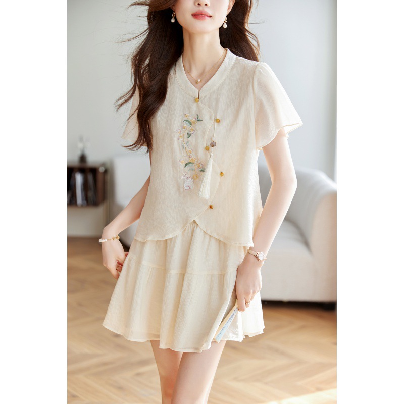 夏季新款重工绣花新中式国风时尚宽松套装女小个子衬衫短裙