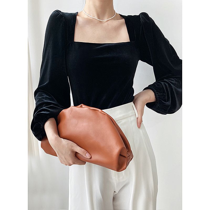 跨境复古法式方领洋气衫内搭女秋冬别致心机锁骨泡泡袖金丝绒上衣