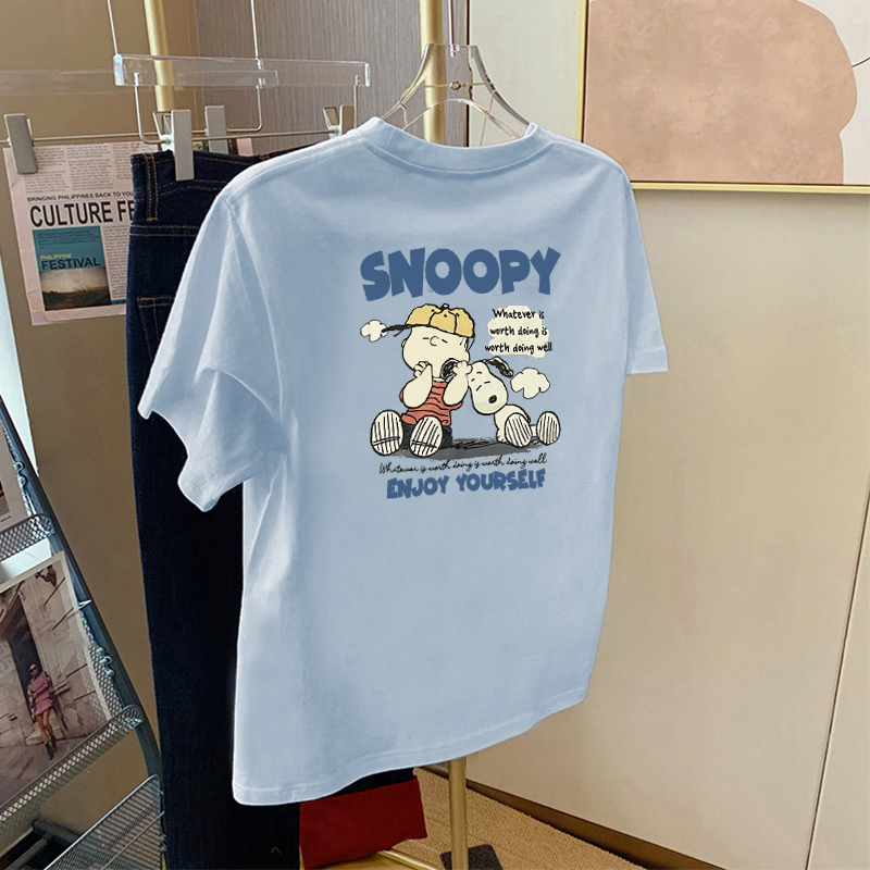 2025夏季新款纯棉蓝色短袖t恤女宽松百搭设计感小众卡通印花上衣
