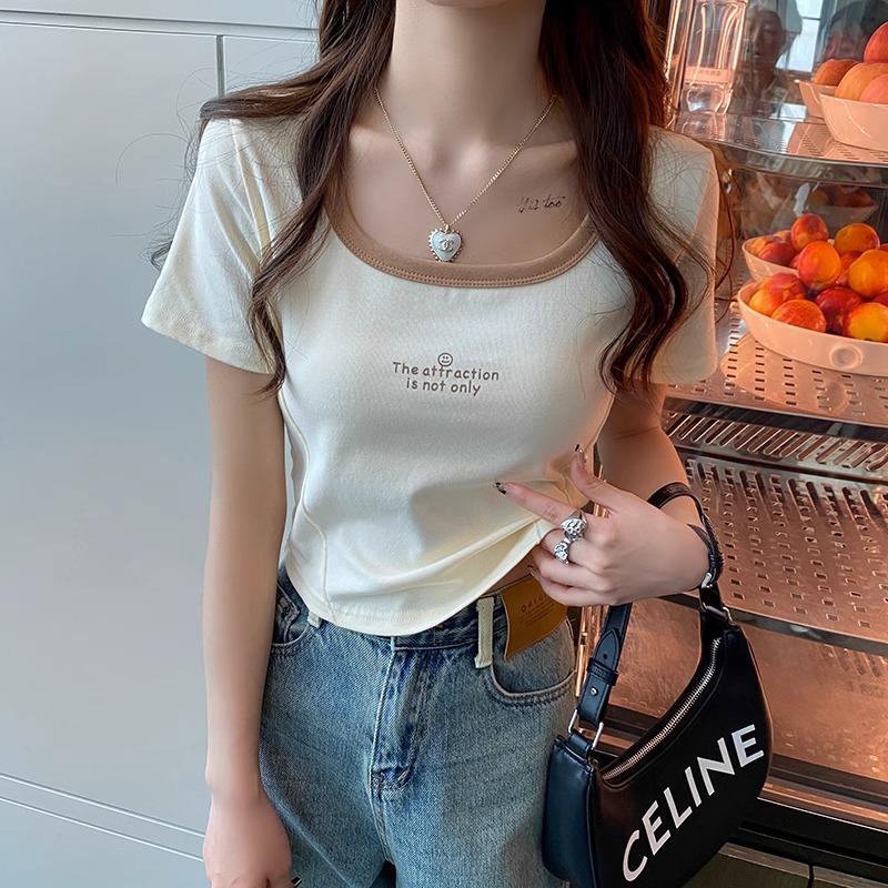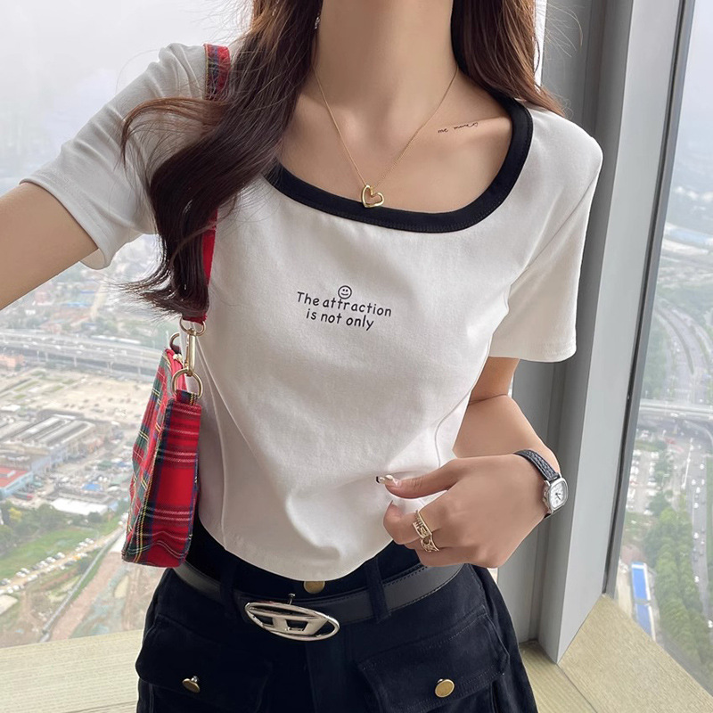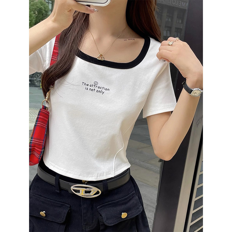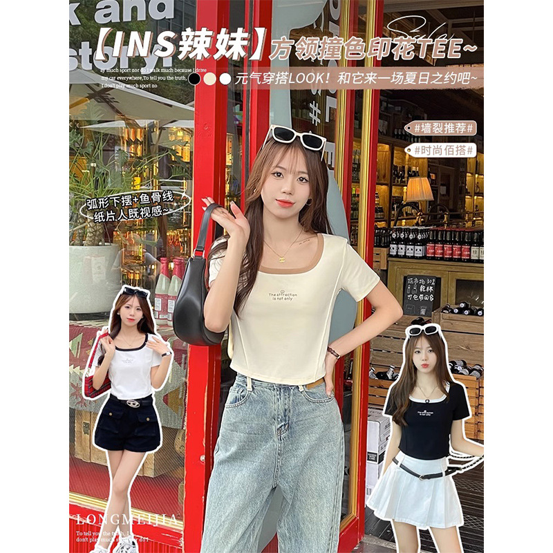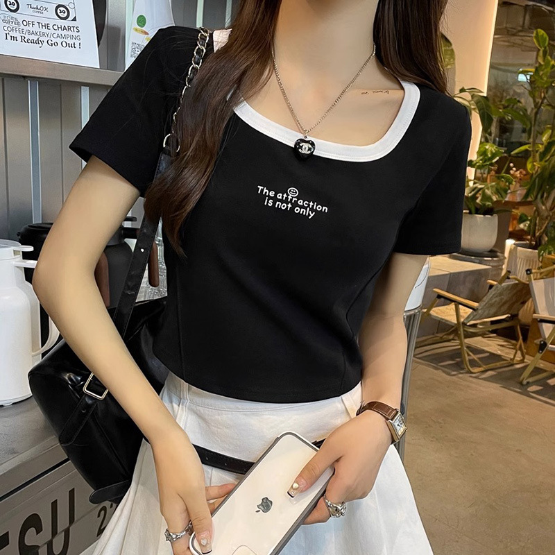 纯棉方领短袖T恤女新款修身显瘦锁骨短款鱼骨正肩撞色体桖上衣夏